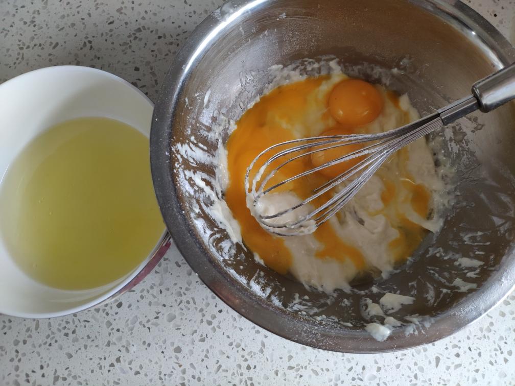 【黄清分离】 加入4个蛋黄,搅拌均匀。