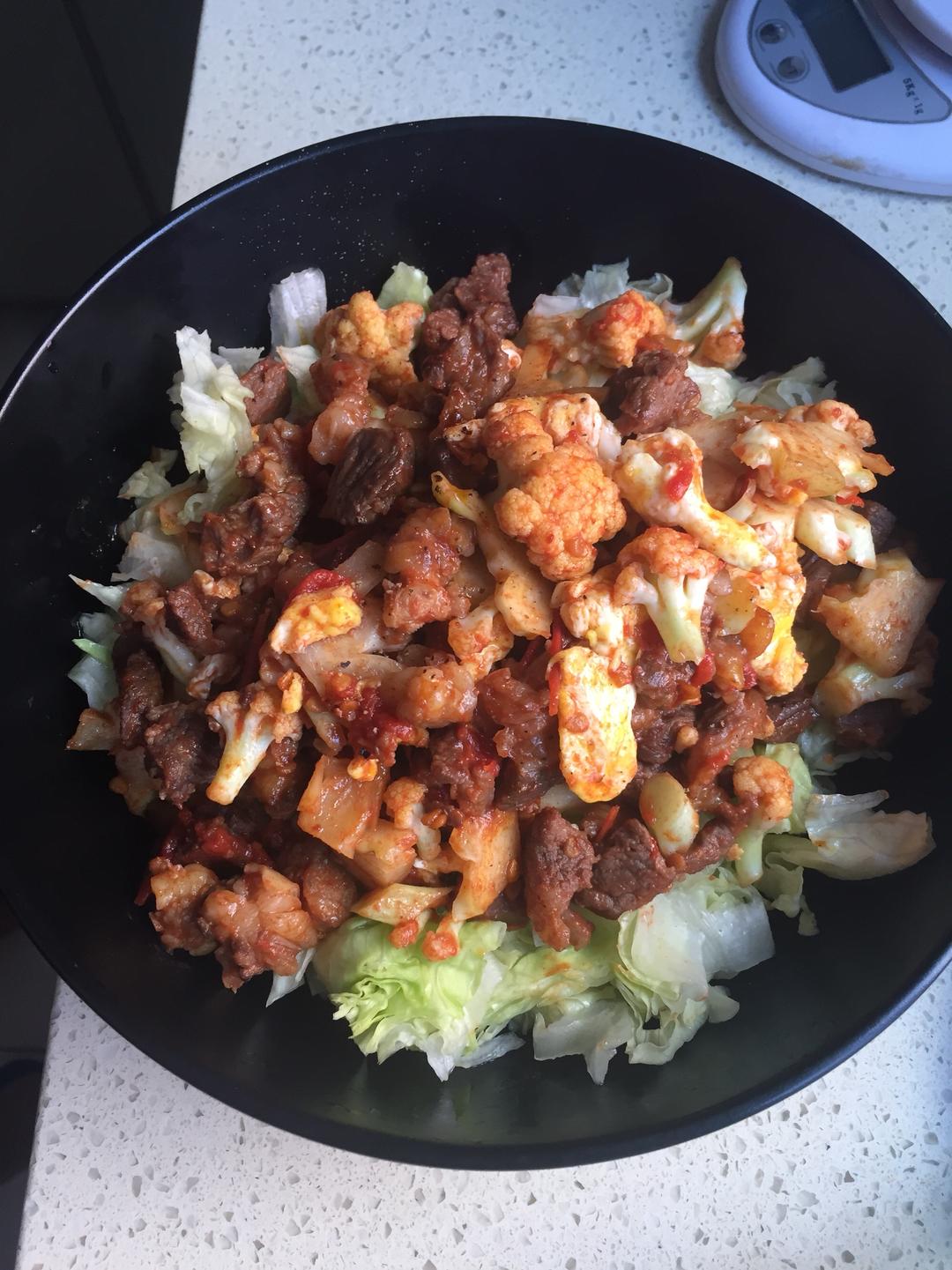 牛肉(筋头巴脑),菜花,鸡蛋,生菜,西红柿,黑胡椒,盐,黄油 感觉西红柿要在多加一点,让番茄味更浓郁