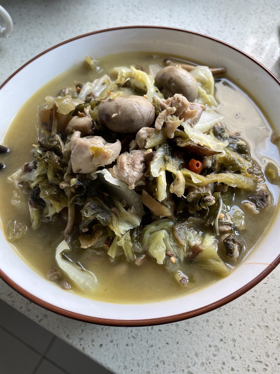 酸菜鸡 鸡腿,口蘑,娃娃菜,茶树菇 (半斤肉一斤蔬菜,酸菜半斤)