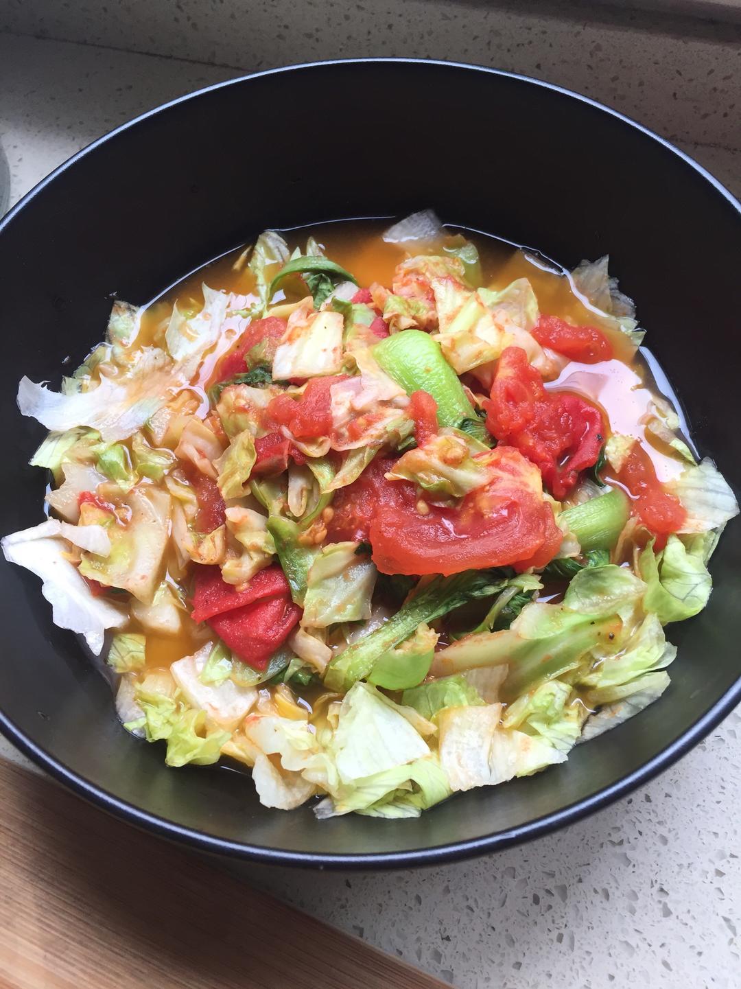 炒圆白菜、油菜、西红柿,黑胡椒,盐调味 生菜切块拌匀
