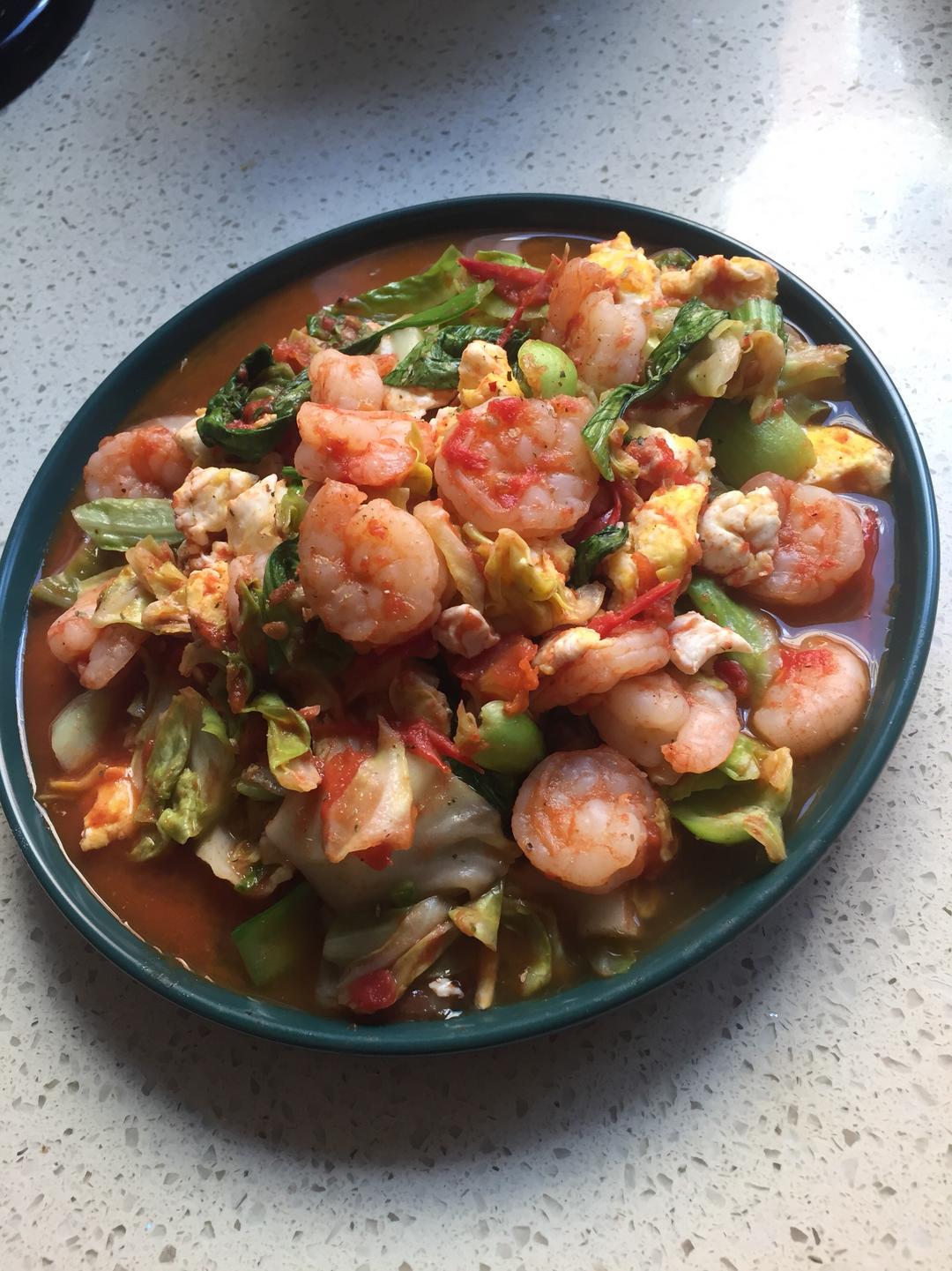 虾仁,西红柿,圆白菜,油菜,鸡蛋 油菜需要在放晚点