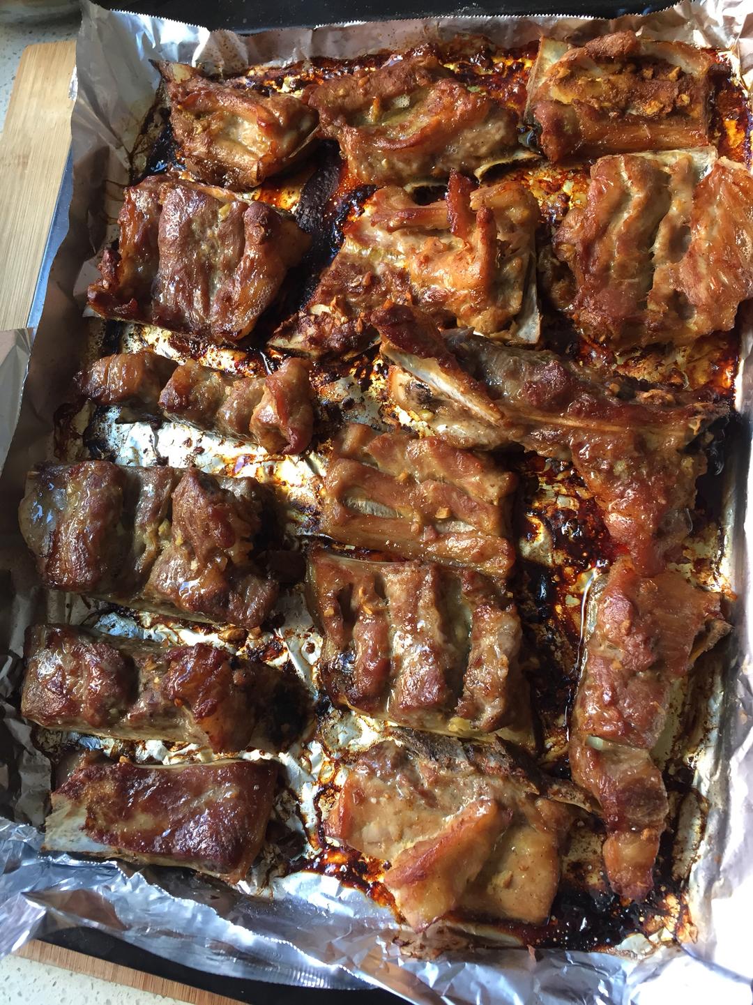 猪排,好多蒜,盐,酱油,葱,姜(可以加一鸡蛋)腌制一晚,烤箱200度30-40分,翻面烤 虽然切的不匀称,不过还是好吃的,讲究点的就切匀称一些,之前用空气炸锅烤的加蛋腌制小块排骨,烤了20分钟