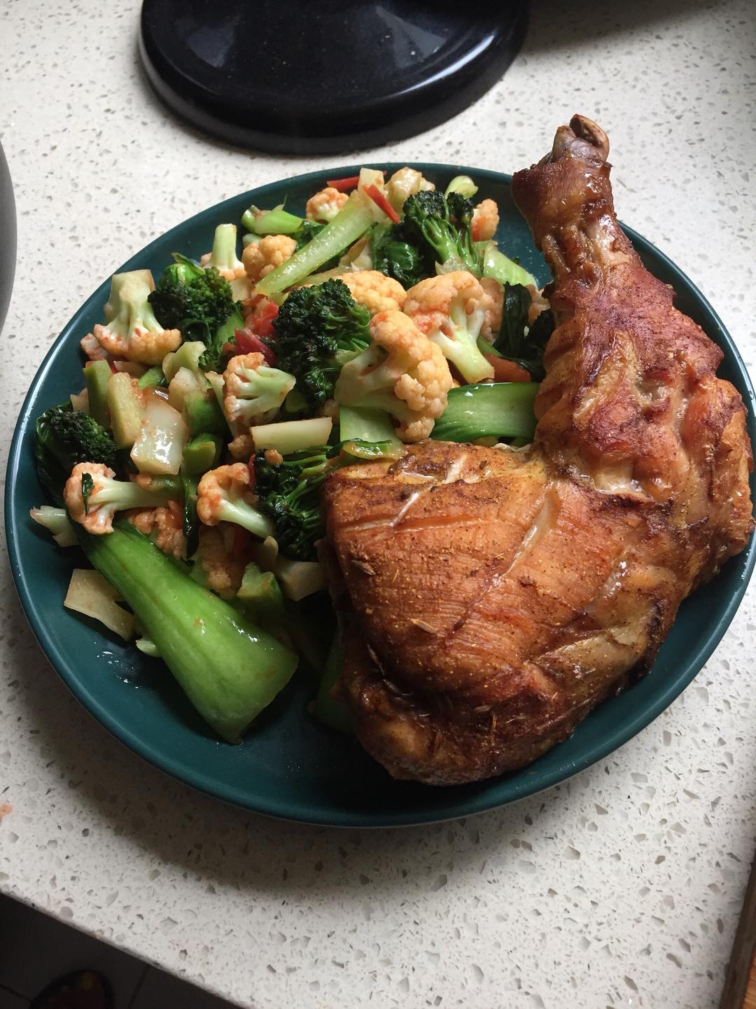 烤鸡腿,西兰花,菜花,油菜,西红柿,盐 因为鸡腿量太大了所以没加鸡蛋 鸡皮炼油用来炒菜 鸡腿用了辣椒,咖喱,姜黄,肉桂,孜然,姜,蒜,酱油,盐,水 腌过夜,本次空气炸锅200度20分,或铁锅煎,出得汁水可以做成酱汁拌沙拉