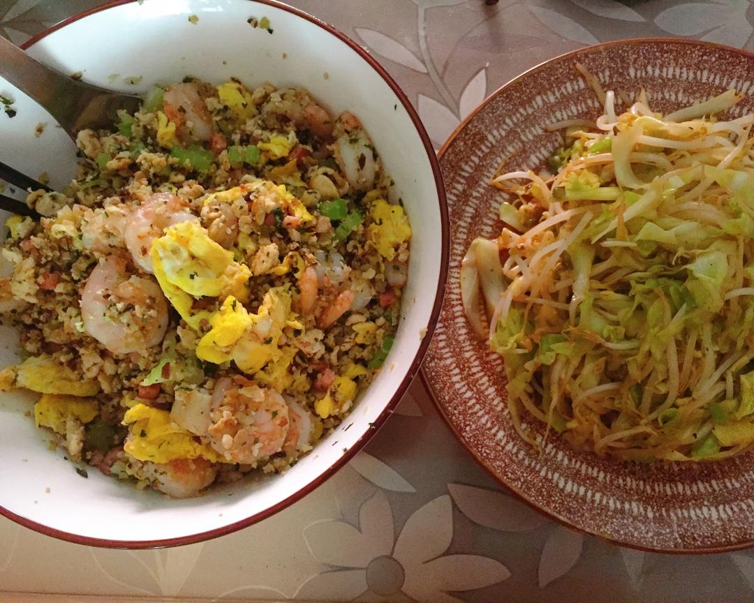北豆腐,菜花,香菇,腊肉,弄碎,鸡蛋,虾仁,芹菜,火腿切丁,黄油,盐,做炒饭 我把芹菜叶也放进去了,还是不放叶子好吃…… 由于懒惰一起炒了圆白菜,豆芽,橄榄油,盐,醋,酱油,普罗旺斯调料,豆芽还是更喜欢吃花椒,醋,盐的版本 这次量太大了,好撑……