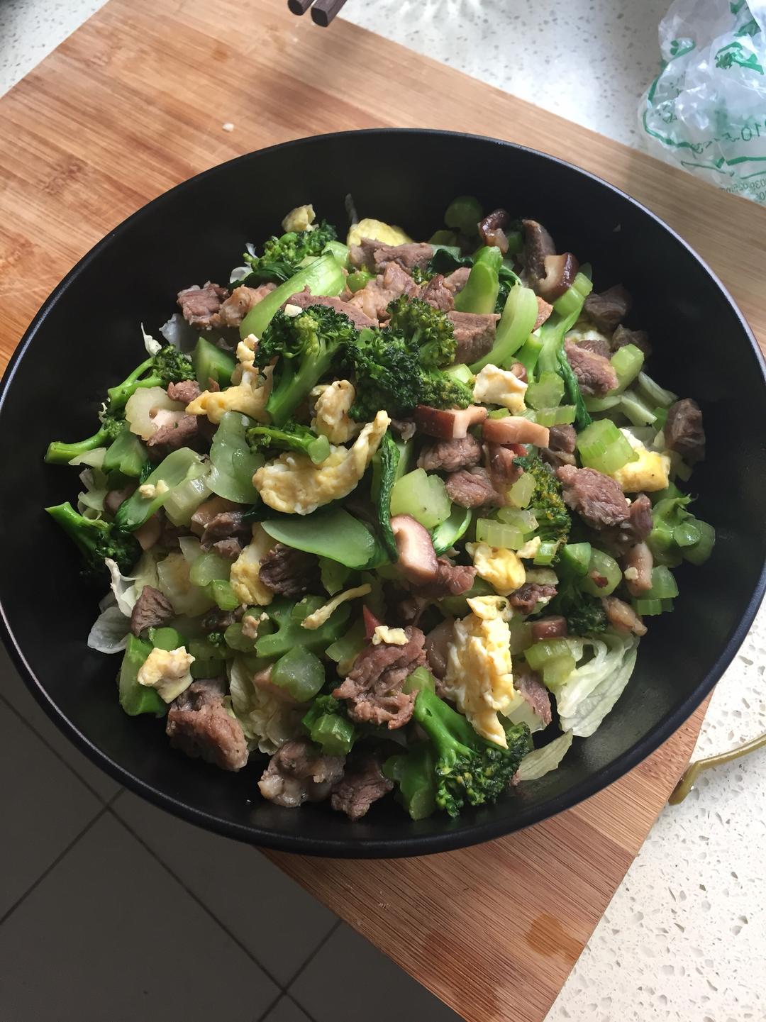 香菇,西兰花,芹菜,腊肉,牛肉,鸡蛋,油菜,生菜碎,橄榄油,盐,黑胡椒,一点点百里香,罗勒欧芹迷迭香辣椒 为了吃起来方便蔬菜切丁,本次腊肉是纯肥肉,炼油炒菜,西餐调料少量添加微微的香味,以香菇芹菜香味为主,与生菜碎拌匀