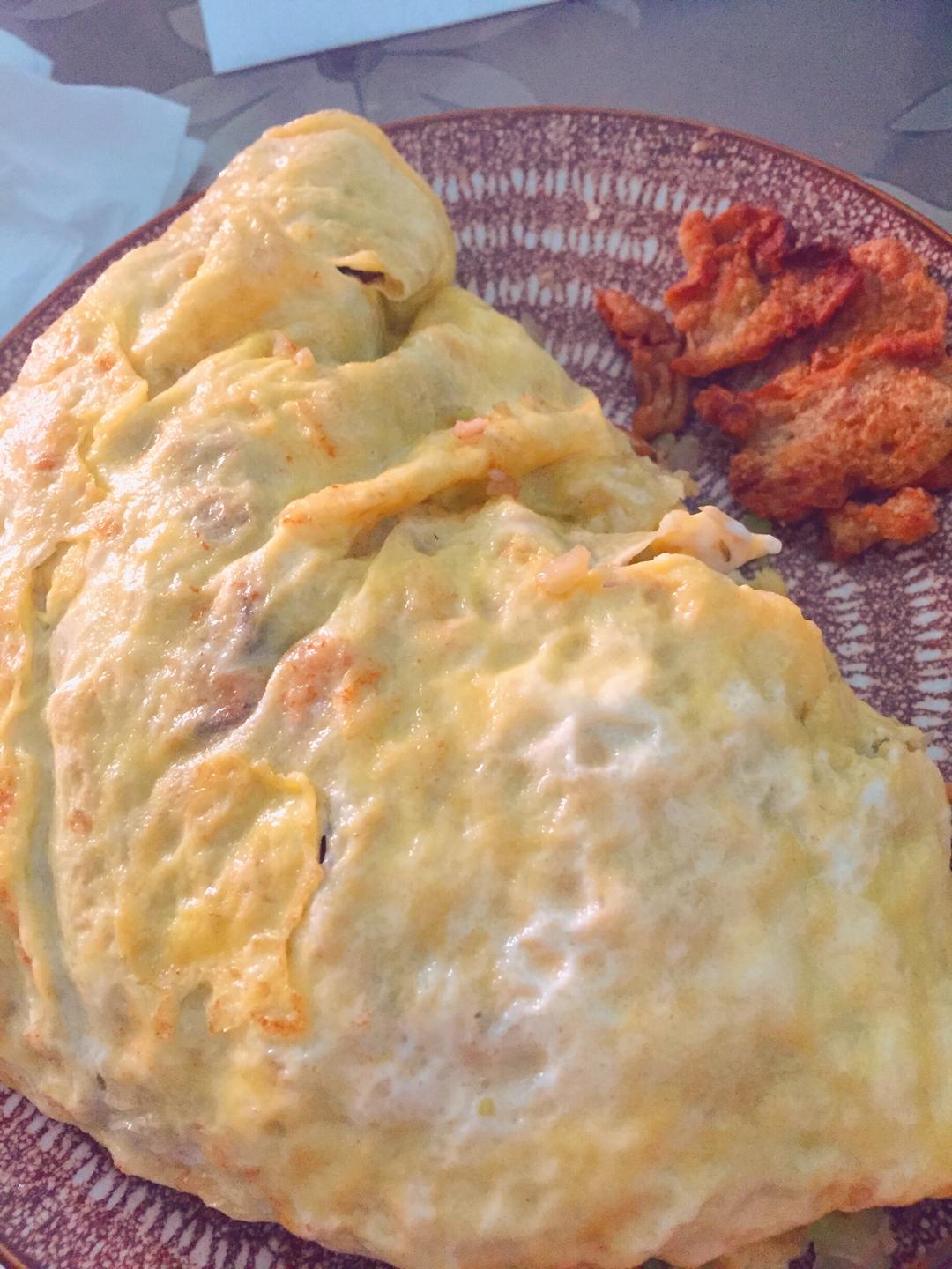 初次蛋包饭,技术有待提升,煎鸡皮至酥脆,鸡油用来炒饭