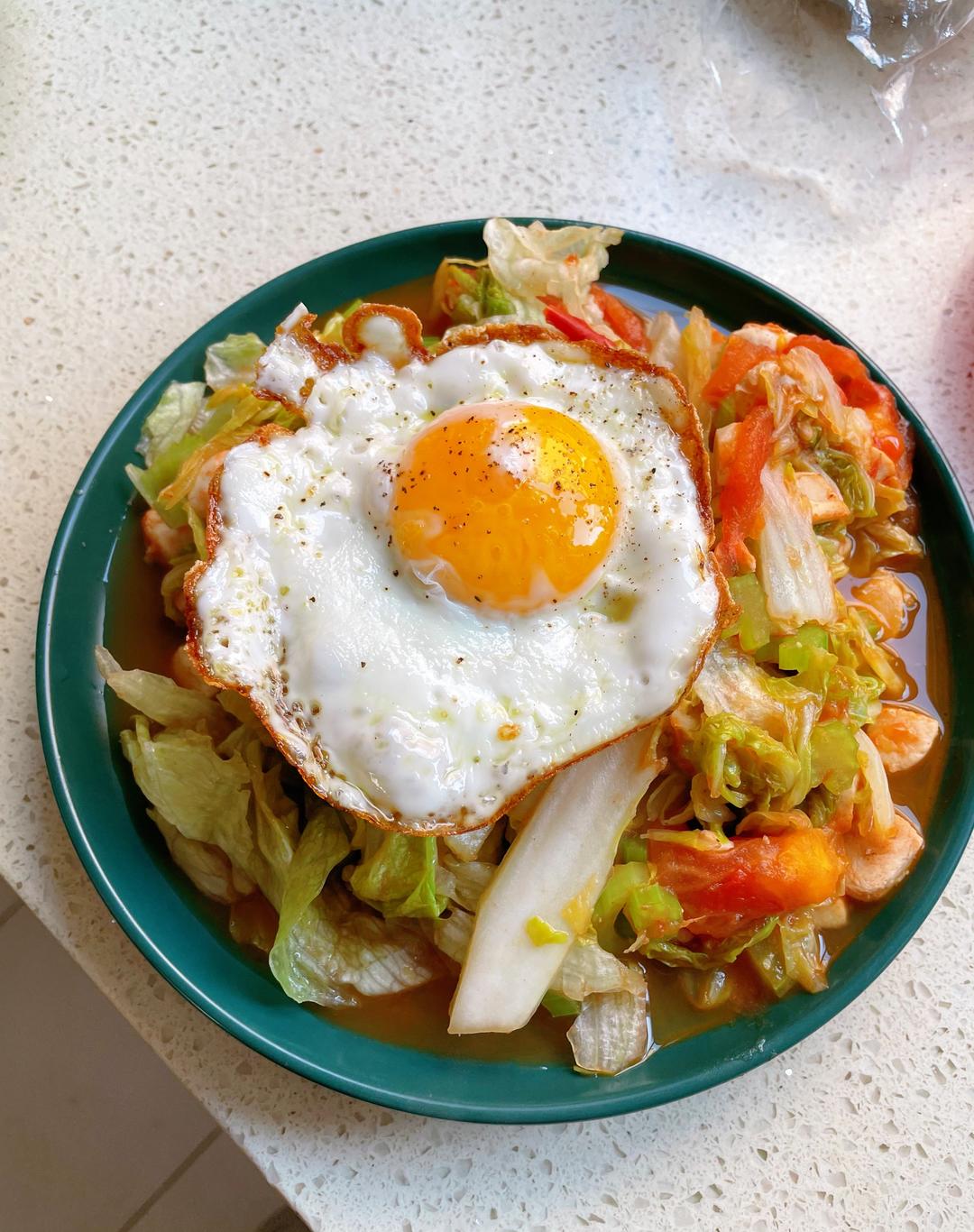 黑胡椒味太阳蛋加番茄鸡丁蔬菜大乱炖