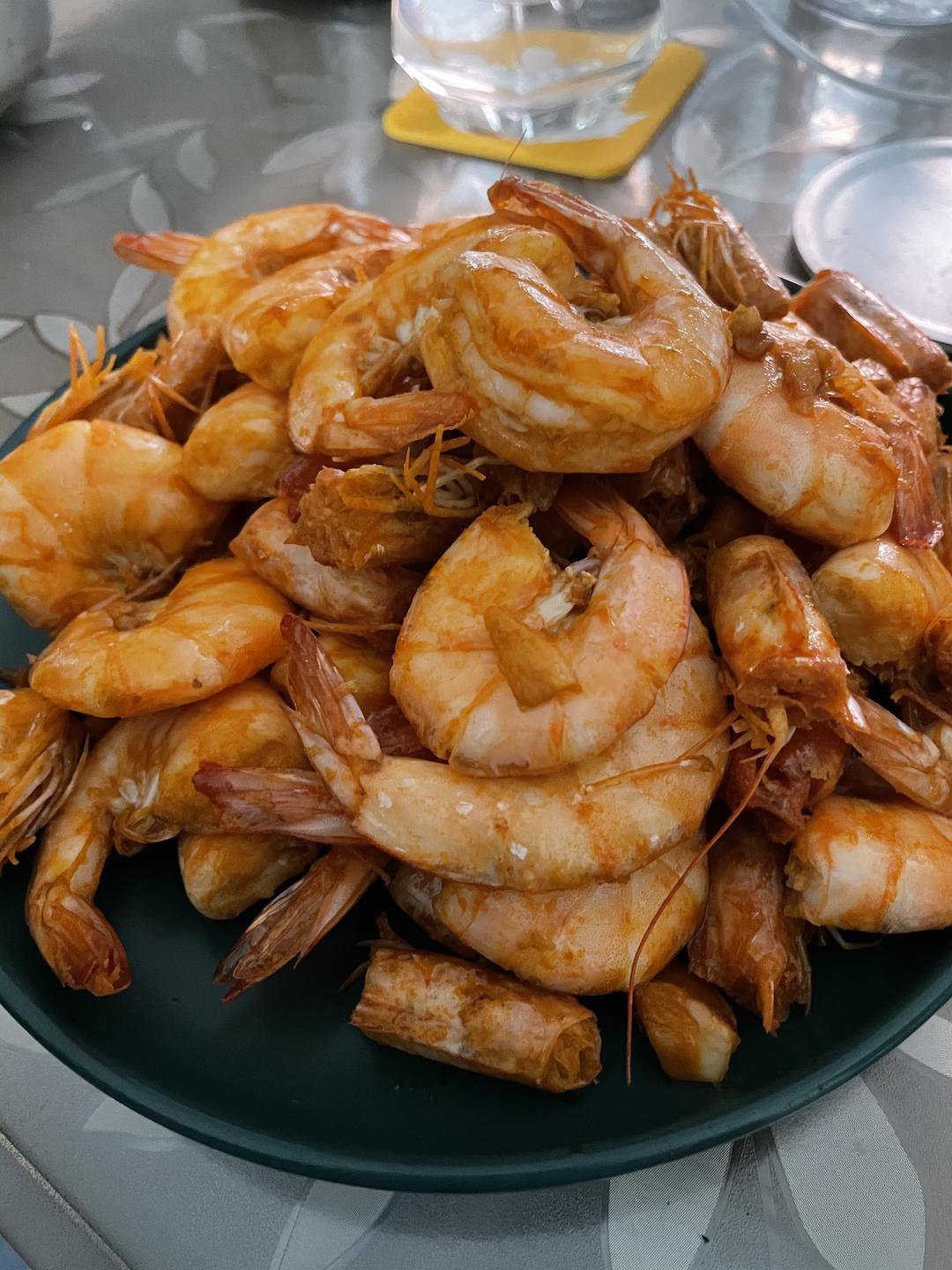 好多虾,好多蒜,一些姜,一些盐,橄榄油 姜蒜爆香 虾头被我切下来先炒出油再加虾身炒熟
