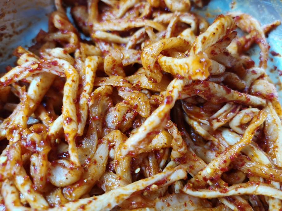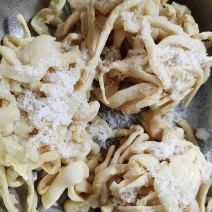 加入盐、糖,揉搓至完全吸收。盐糖是否适量,搓揉过程中可以尝一下。