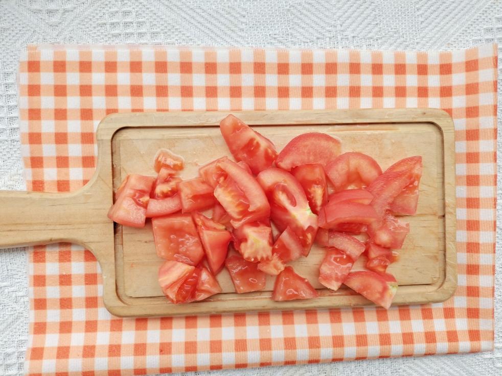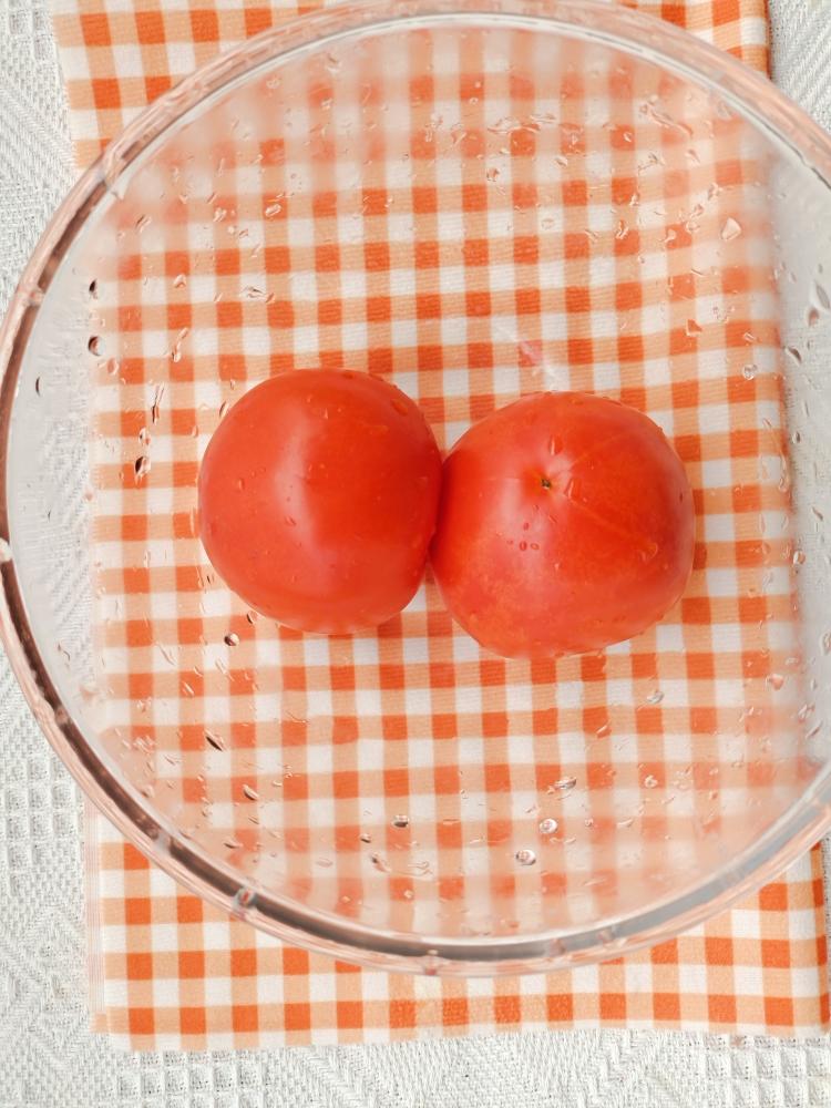 2个番茄🍅用刀划十字口,倒入开水,撕去番茄皮