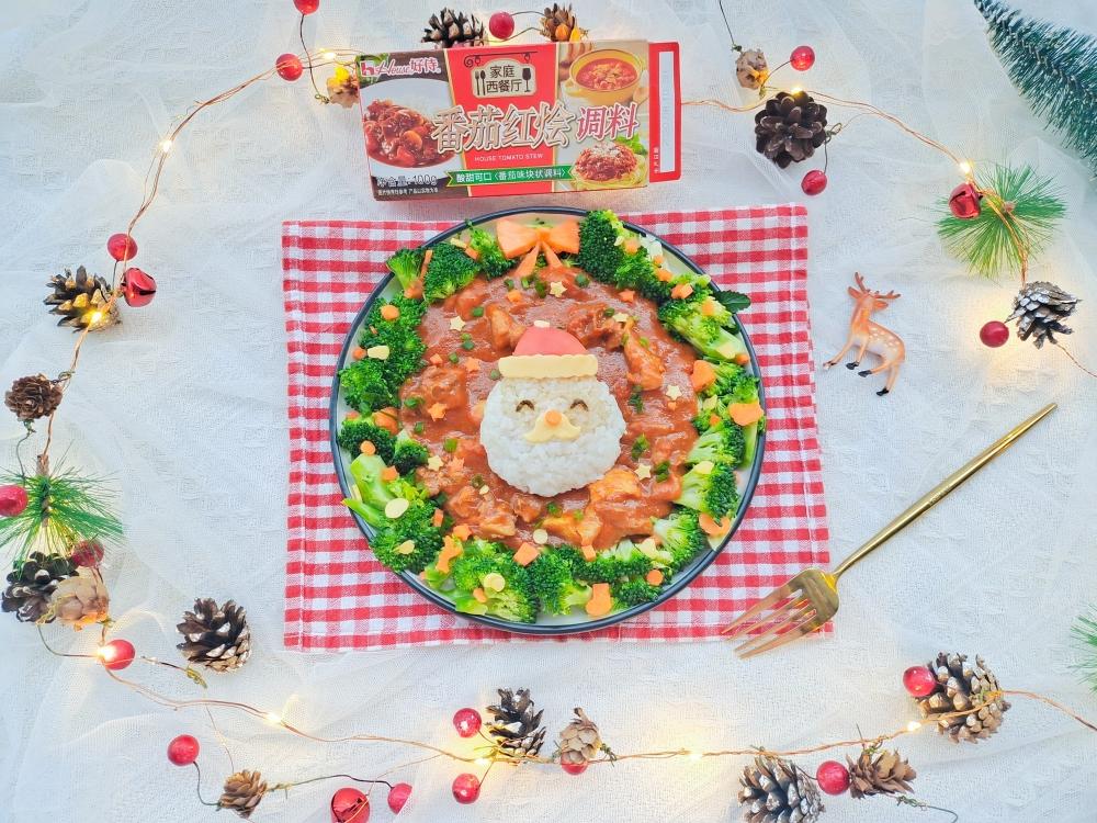 倒入番茄鸡肉,摆上可爱的圣诞老人饭团