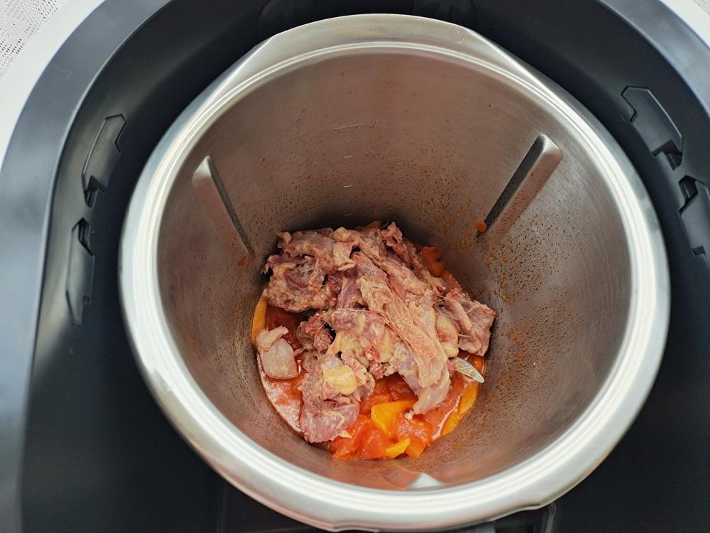 把番茄红烩调料倒入搅拌融化,设置15分钟/130℃/1档(反转),一边煮,一边倒入清水