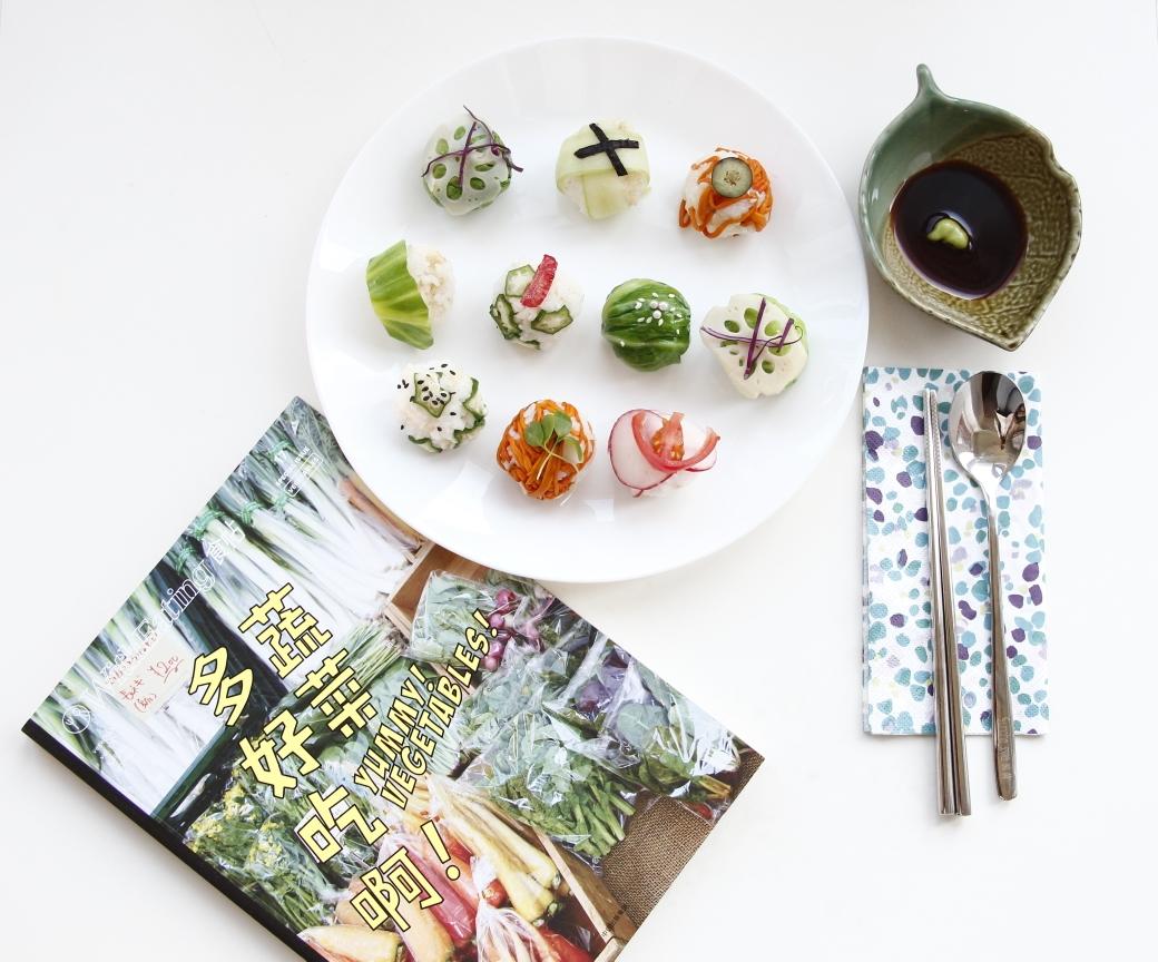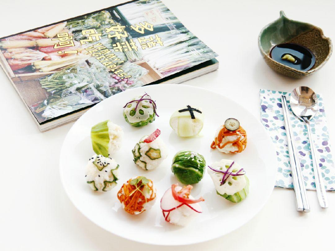蒸米饭的时候,把配料准备好。 切片食材: 黄瓜用刮皮刀削成长条,撒盐腌制10分钟,使其柔软。 水果胡萝卜切成薄片撒盐腌制10分钟,使其柔软。 紫甘蓝切丝 圣女果,树莓, 焯水: 虫草花 包菜 秋葵切片焯水 莲藕切片焯水 修剪: 海苔剪成长条。