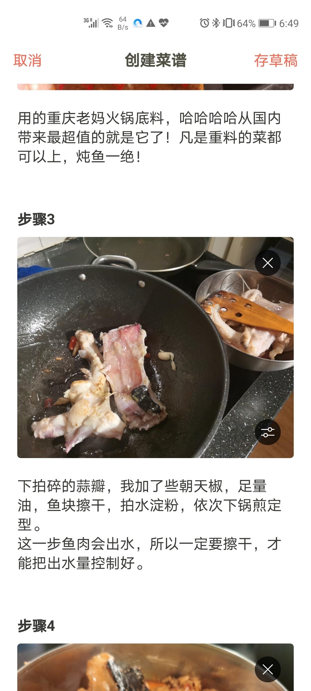 另起锅,少量油,加适量火锅底料,炒香,加鱼块略炒,加酱油,豆瓣酱调味,再加适量温水(淹没鱼块)。 中小火,盖盖,让它咕噜咕噜去吧,期间可以翻个面啥的,至少炖半个小时。 炖好了鱼皮会软软糯糯的!