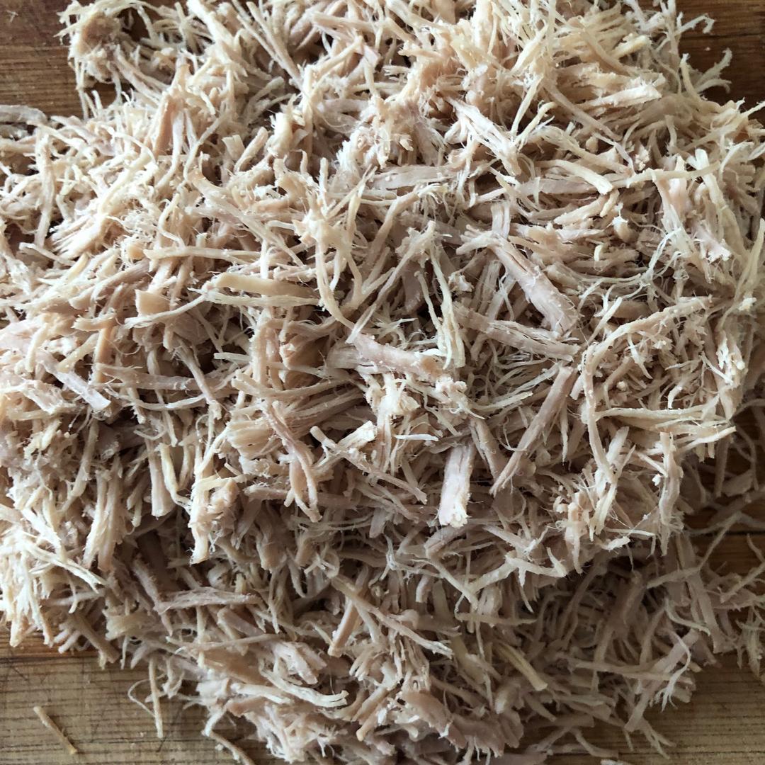 放凉一会儿,用擀面杖把肉压松压扁,再用手掌搓一下,用手撕成细丝。肉丝越细越好。