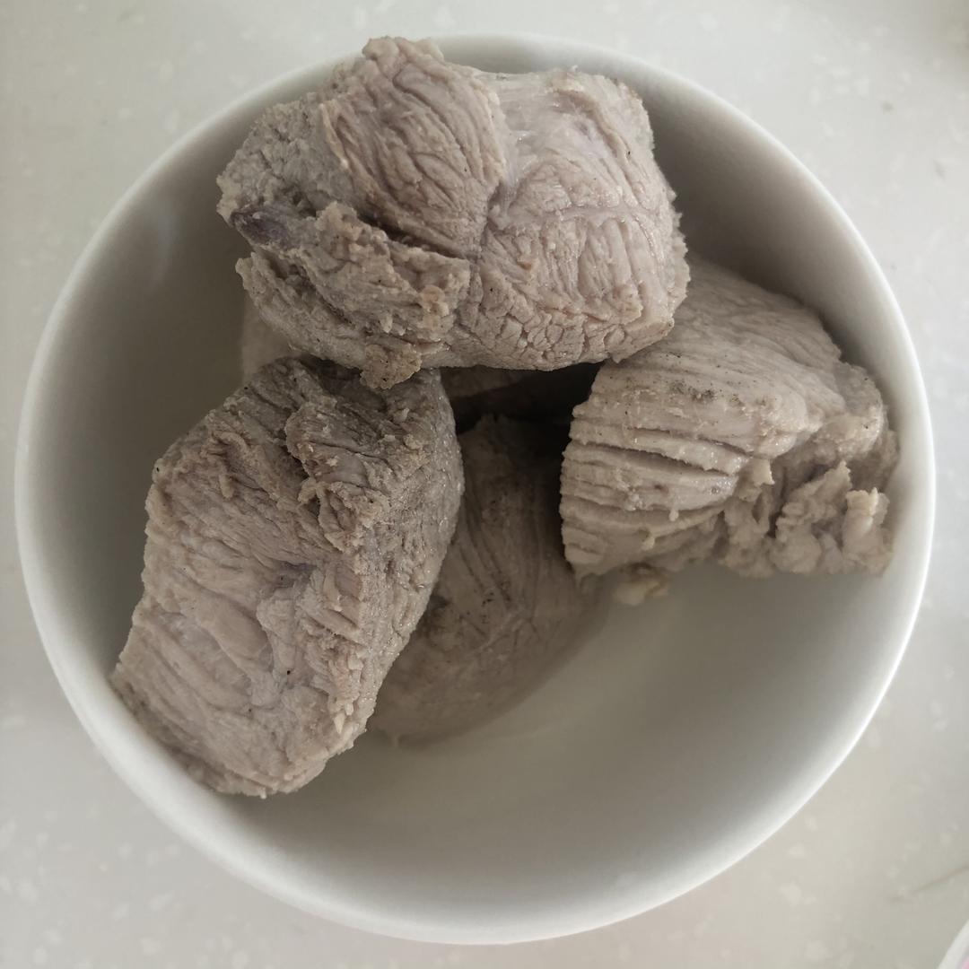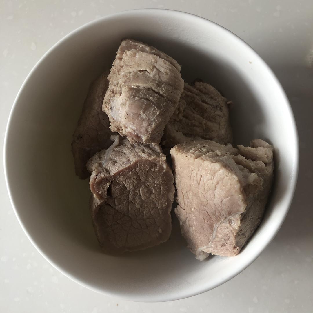 先将肉洗净切成小块,顺着肉的纹理切。冷水放入肉,煮沸后用筷子涮掉血沫夹出肉块。