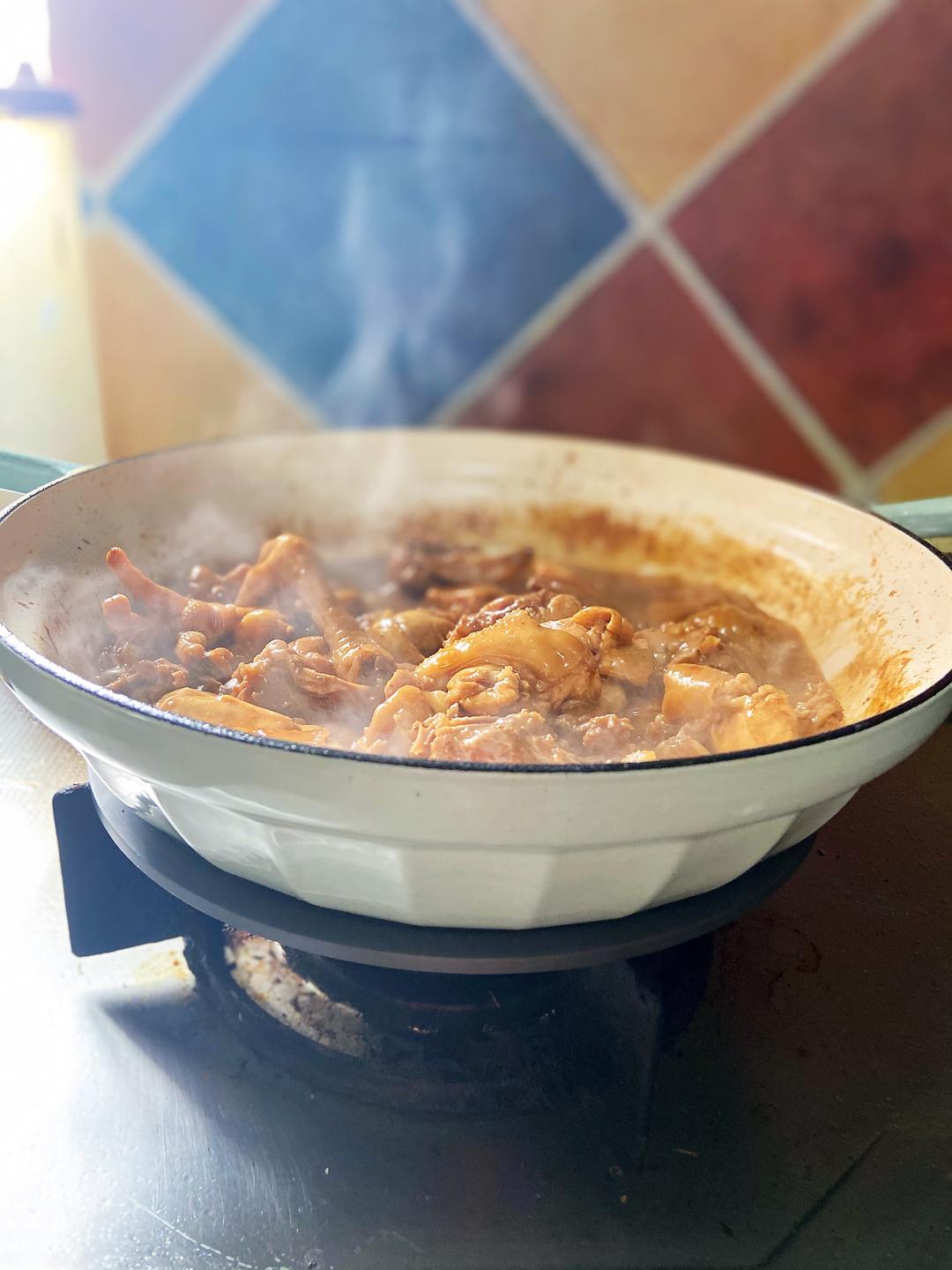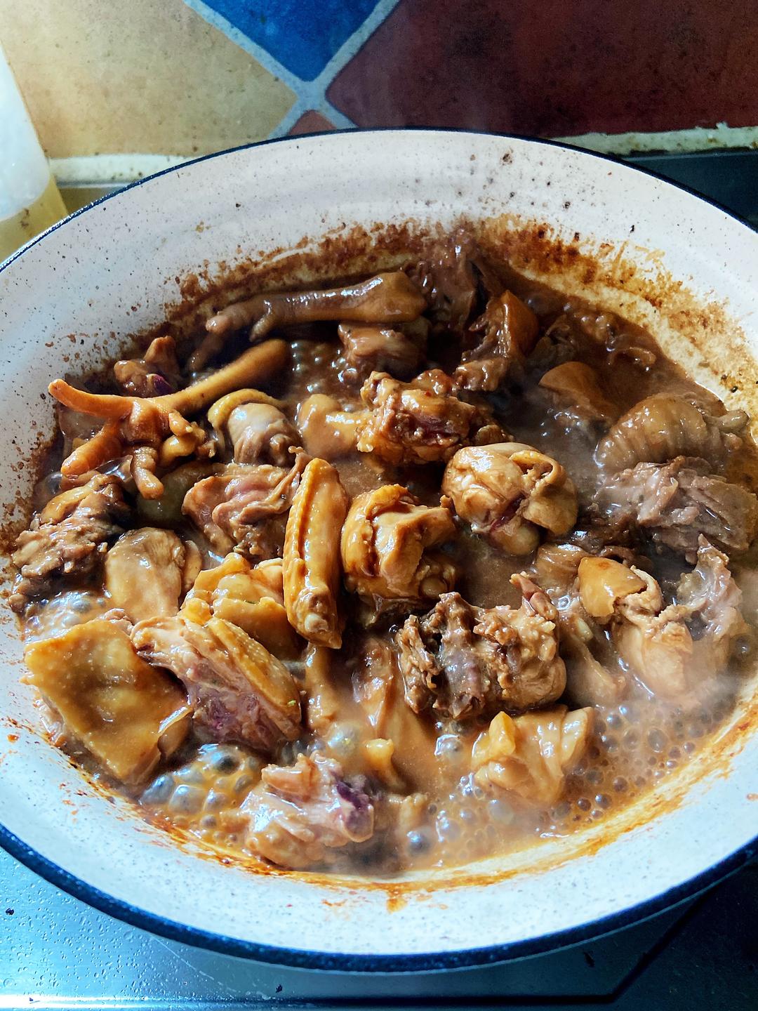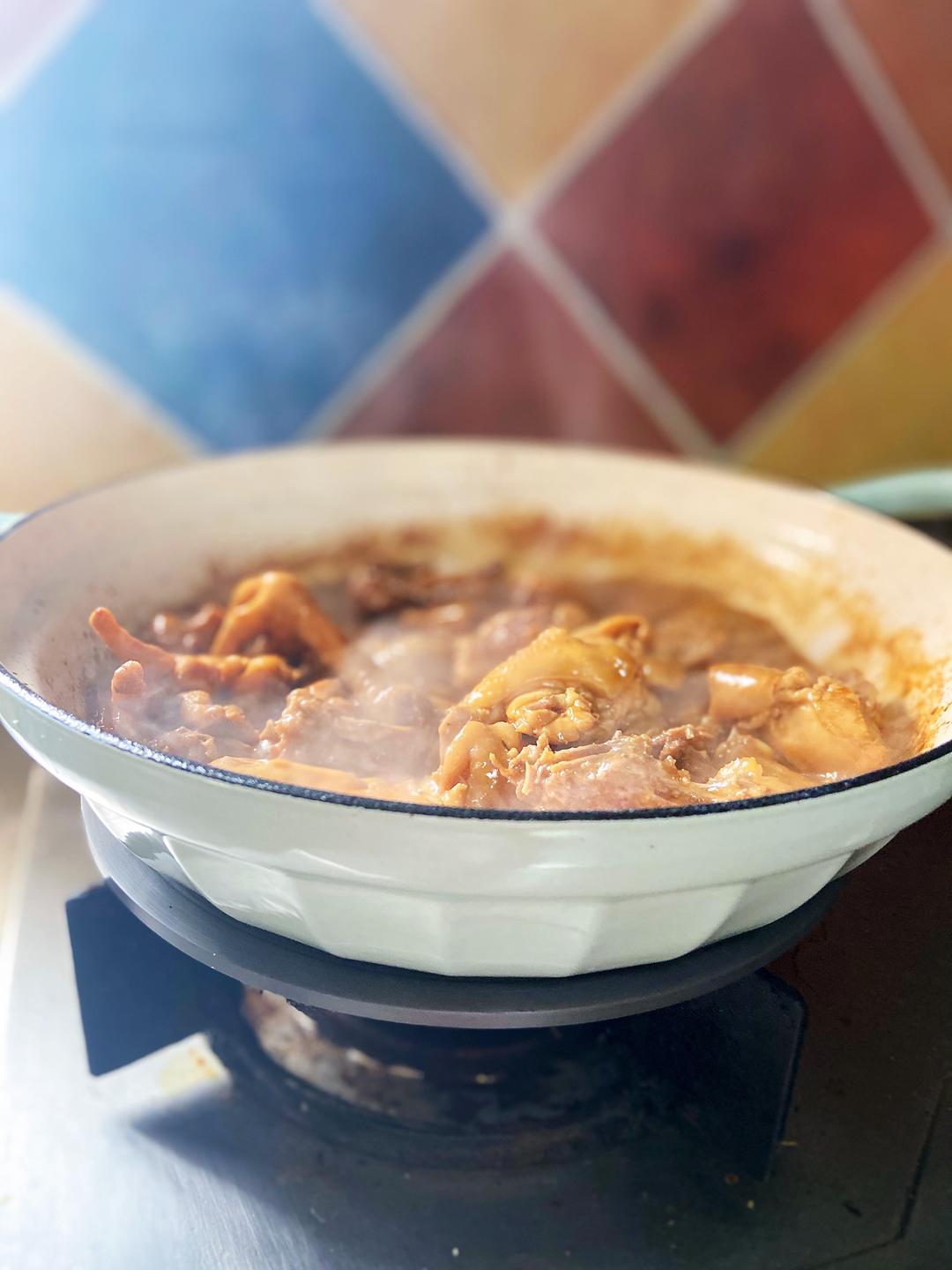 来点老抽上色,倒入一碗花雕酒,中小火慢炖15分钟,如果水分太少,可以适量加水,不要加太多。
