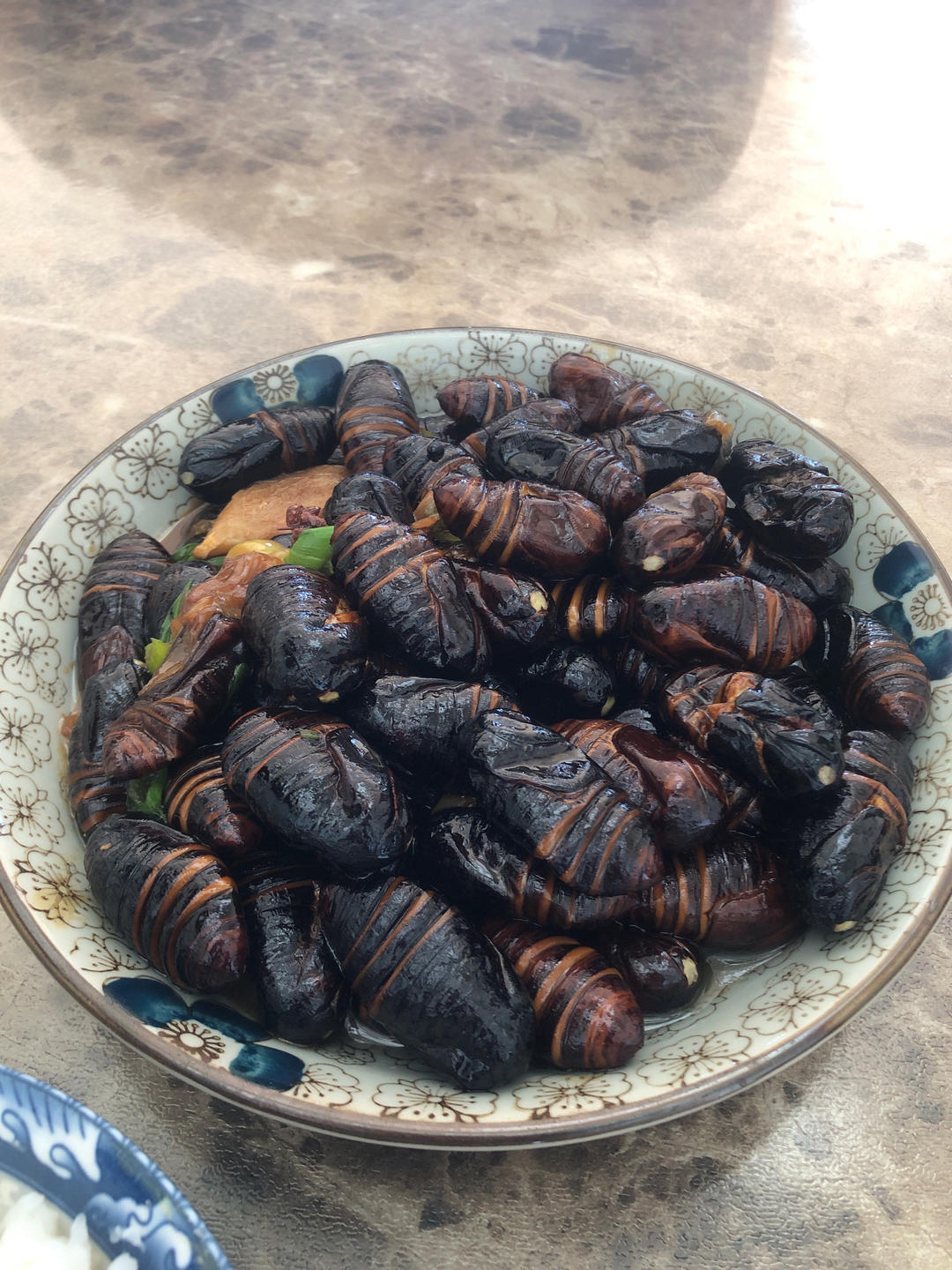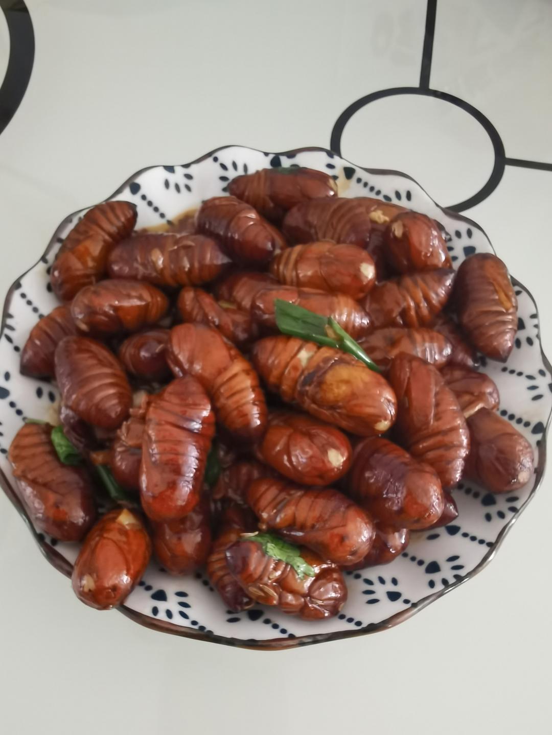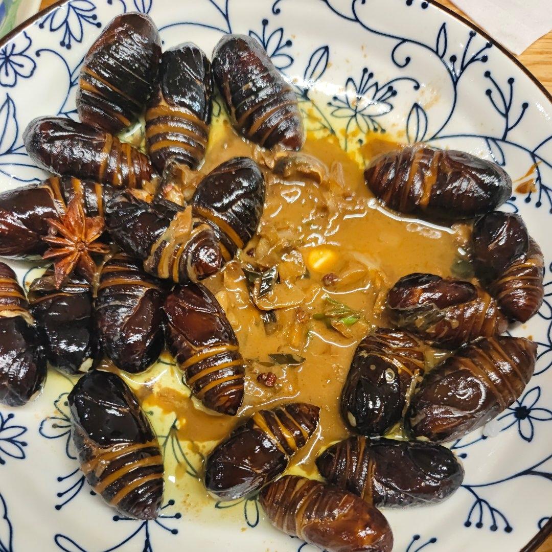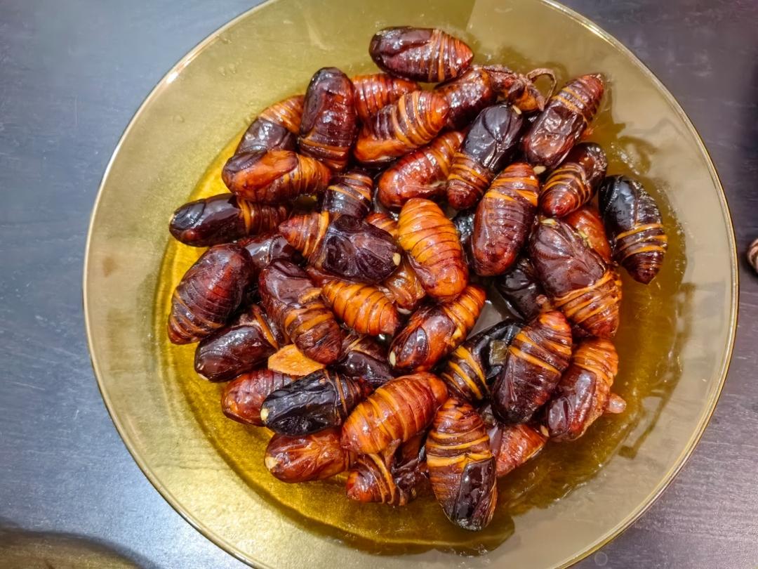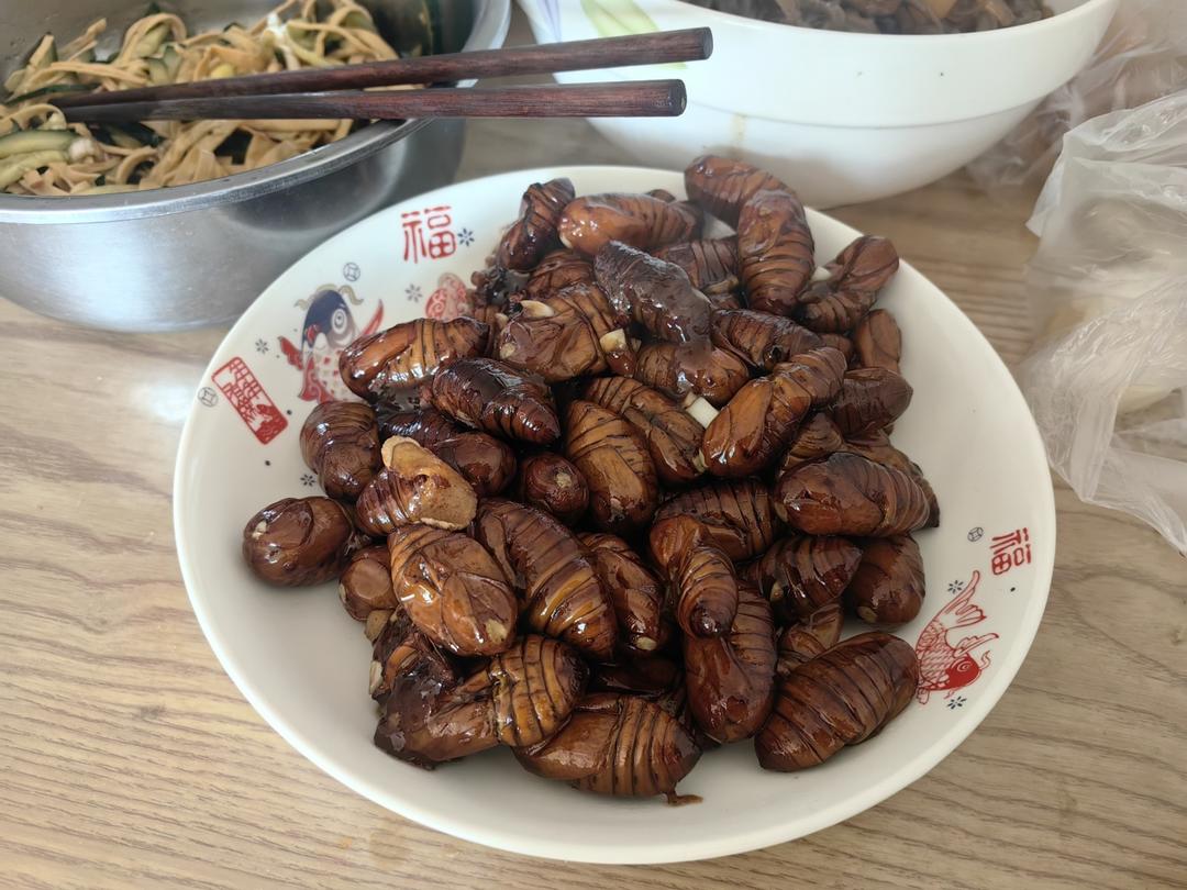 勾芡的淀粉放的略多,放了喜欢的孜然,好吃。就是好多年不见有卖黑色蚕蛹了。