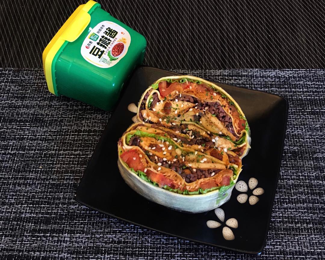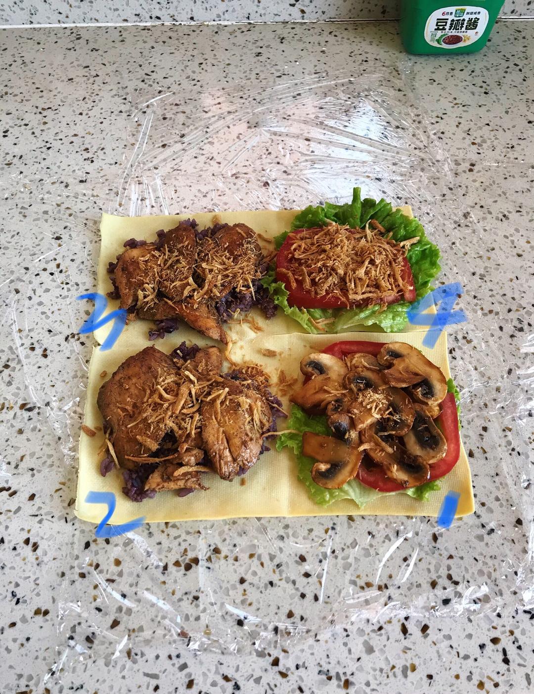 各区域先刷点豆瓣酱或者黑胡椒酱等自己喜欢的酱料,然后开始放食材,依次是: 1⃣️:生菜,西红柿,口蘑,一点点肉松 2⃣️3⃣️:米饭(加了点黑米),鸡胸,一点肉松 4⃣️:生菜,西红柿,很多肉松😂 放什么怎么放随意,自己喜欢就好