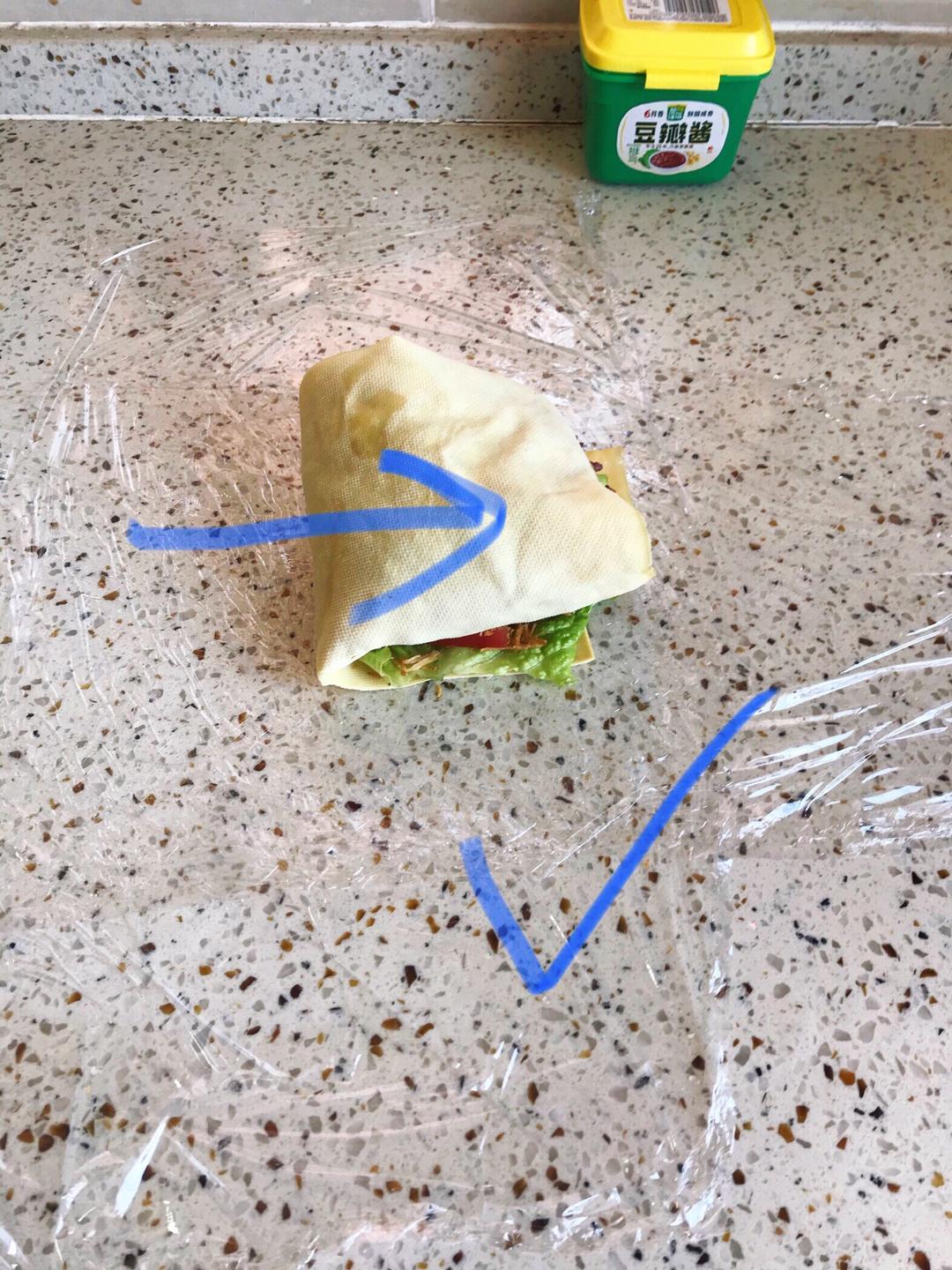 把四周的保鲜膜折过来包紧,切开可以再在表面刷点酱料~