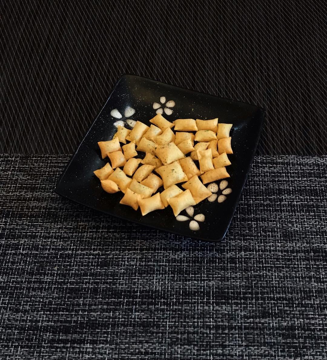 剩下的豆皮可以不焯水,泡在盐水中半小时以上,取出用厨房纸擦干水分,撒上烧烤料,烤箱中层180度烤15分钟左右,就是香脆的烤豆皮啦!