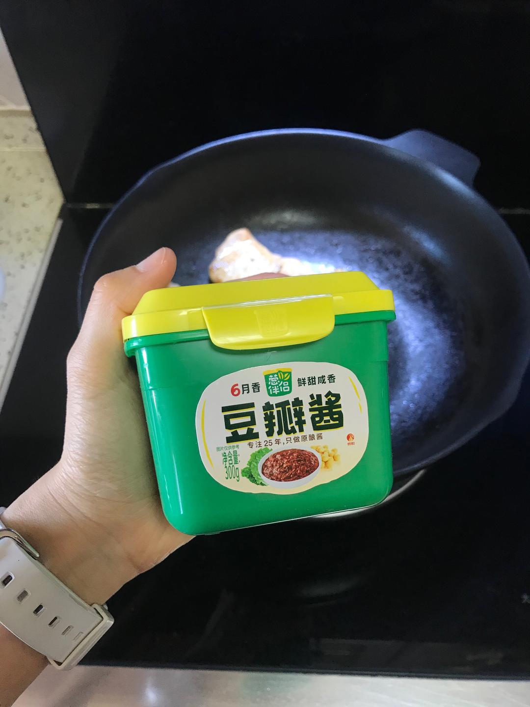 把煎好的鸡胸放到一侧,再刷一点油,放入半勺豆瓣酱炒一炒,再和鸡肉炒匀