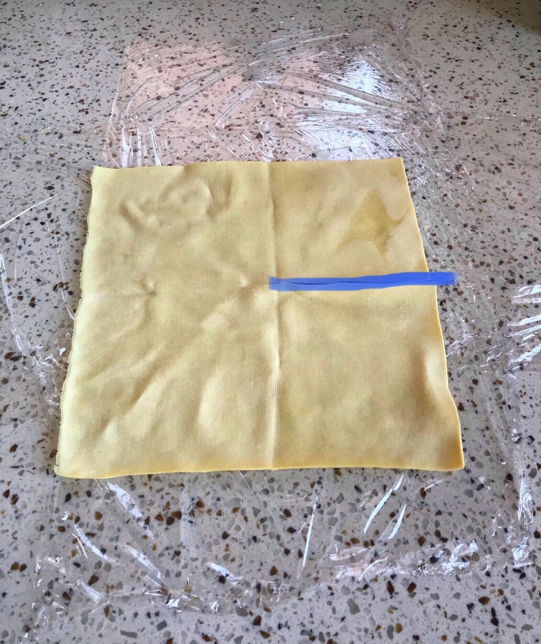 豆腐皮放在保鲜膜上,如图切一刀,切一半就行不要切断