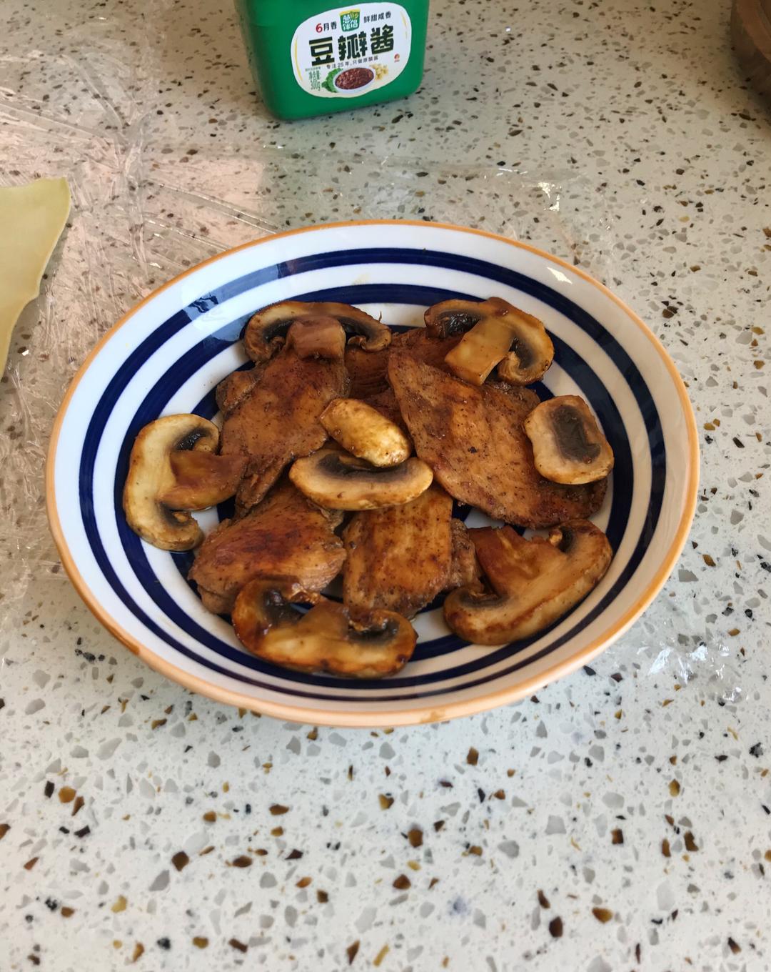 准备工作:鸡胸切大片,➕半勺料酒、半勺生抽,一点黑胡椒腌制,一个口蘑洗净切片,生菜洗干净,西红柿洗净切片