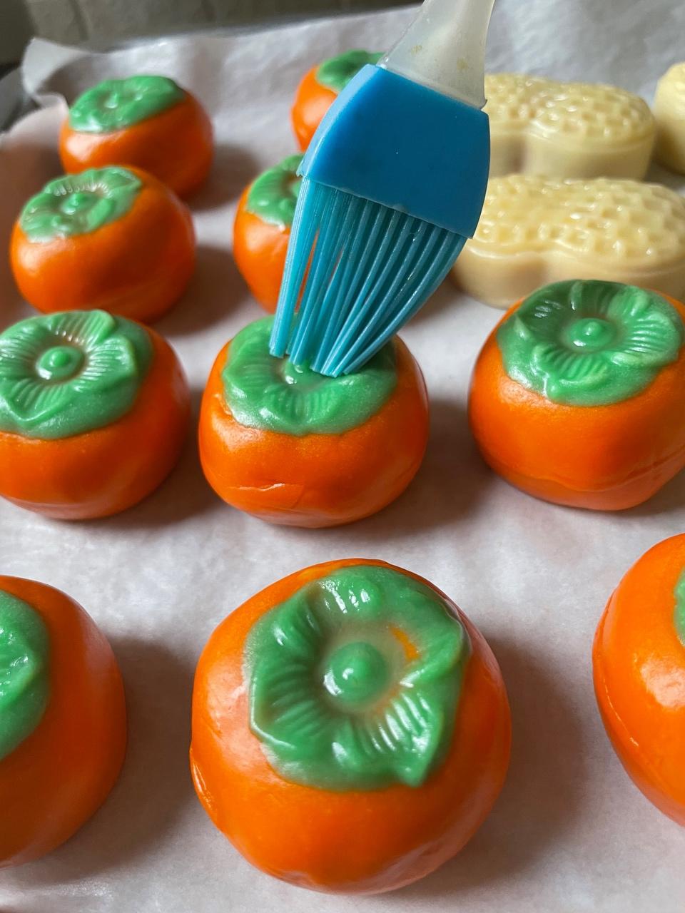 将做好的月饼放置在不粘烤盘上,表面轻轻的喷一层水雾 ; 放置预热好的烤箱中下层,上下火,180度5分钟,出炉后给花生造型的月饼刷一层蛋黄水,柿子的叶子部分也刷一层薄薄的蛋黄水
