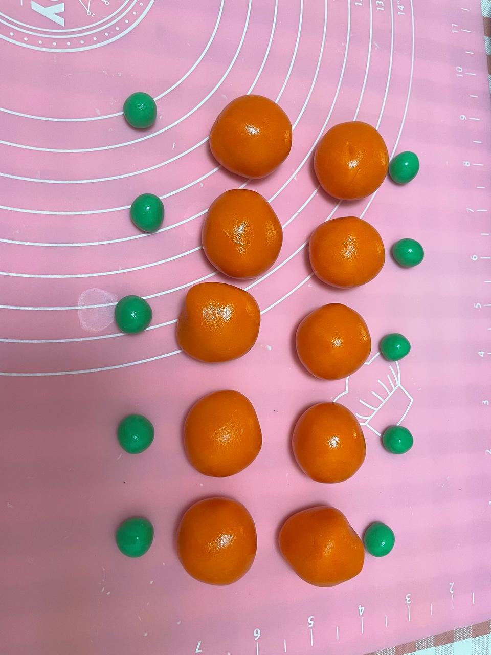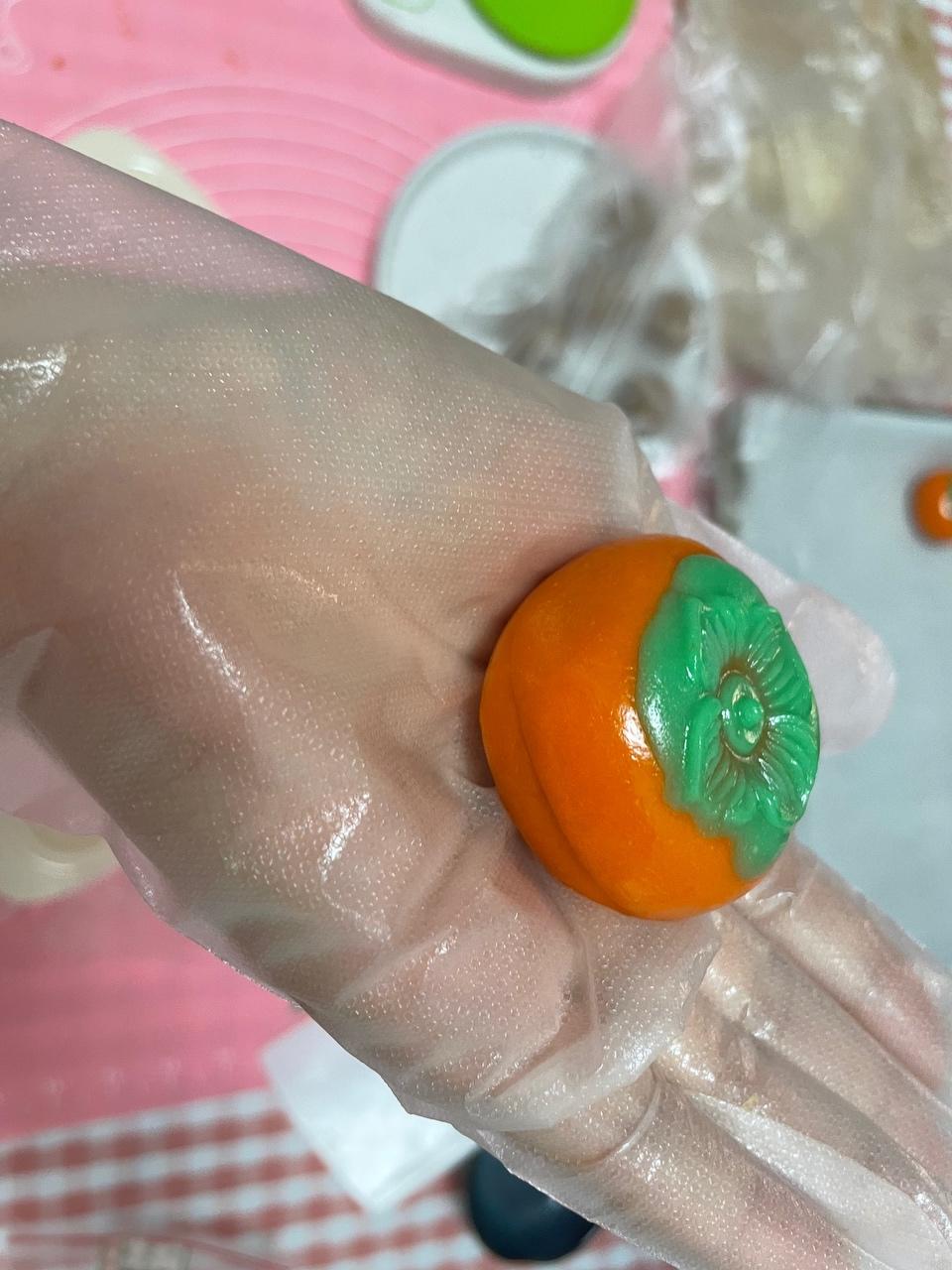 轻轻按压后打开模具,轻轻拿出,一个柿子造型的月饼就完成了。