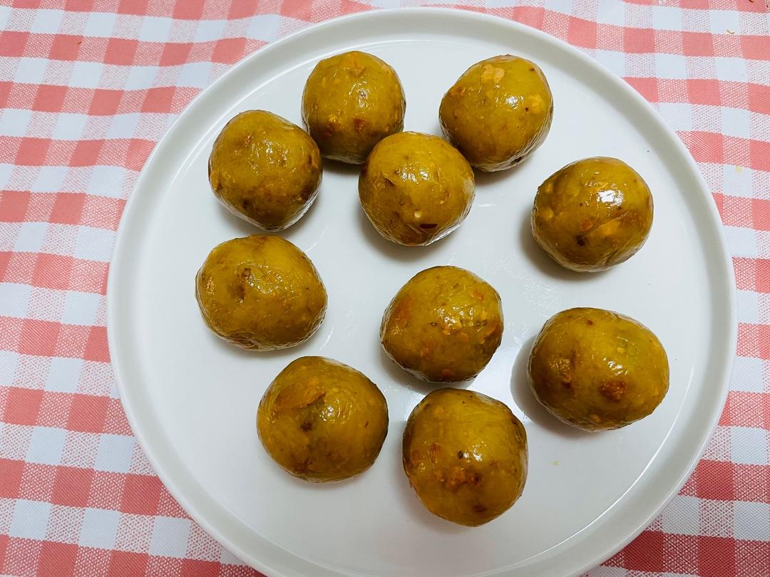 250克白莲蓉馅料加入50克肉松,搅拌均匀后分成10个小团子,团到表面光滑待用。