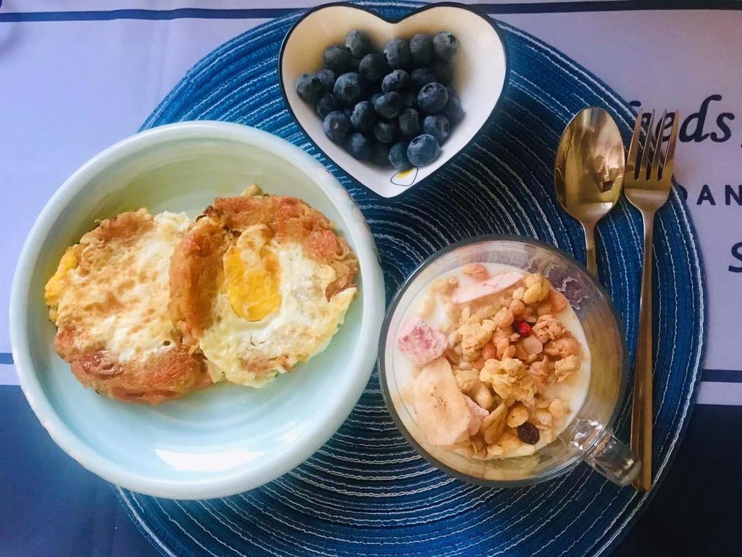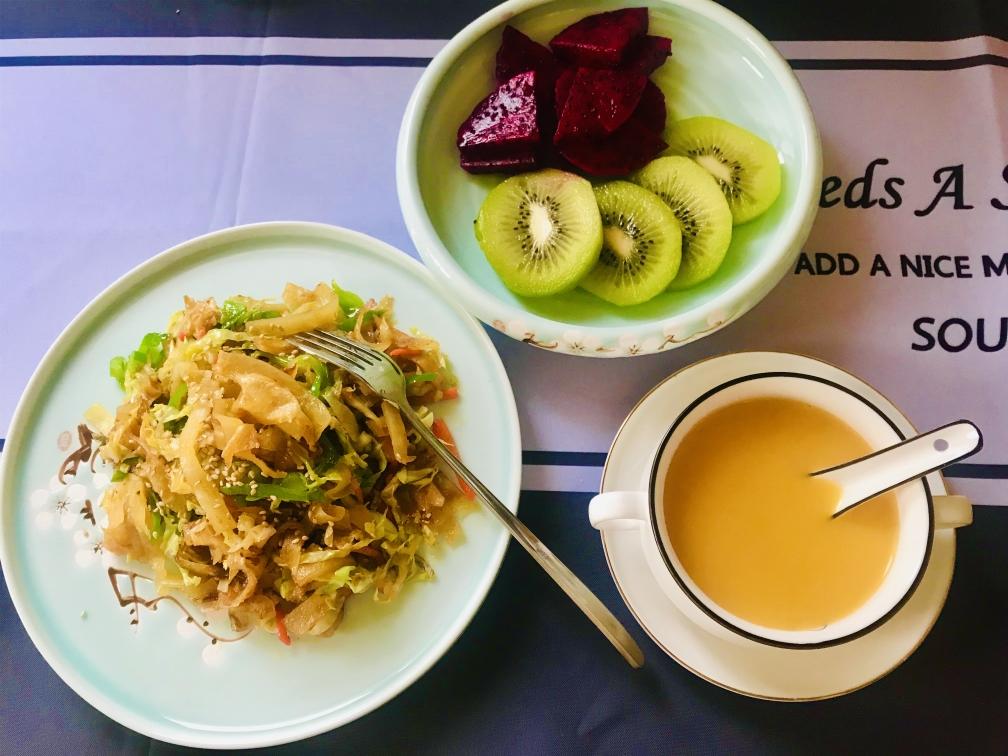 十八、土豆丝、胡萝卜、鸡蛋饼,燕麦酸奶。