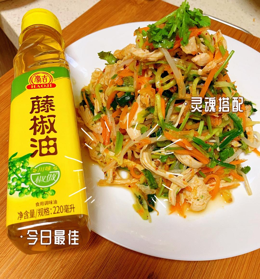 这一步就是搅拌,把食材全部倒在一起,放上盐,味精,米醋,味极鲜一丢丢,在放上我们的~~豪吉藤椒油,不停搅拌就可以啦。 悄悄告诉你,这一步为了更🈶️色泽,我加了一些辣椒油,味道更加棒👍