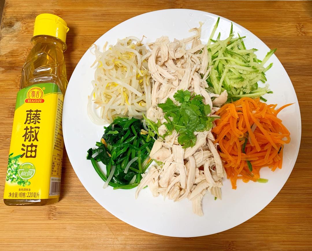 请把食材排排站,鸡胸肉,胡萝卜🥕,菠菜,豆芽,后来➕个小黄瓜🥒,还有我们明星产品~~豪吉藤椒油