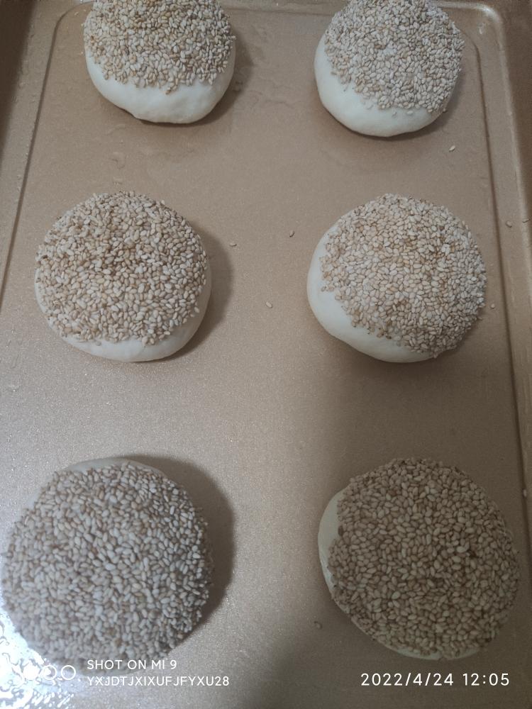 重新滚圆(也可以分割好,直接滚圆),沾水,沾白芝麻,盖湿抹布室温发酵至2倍大