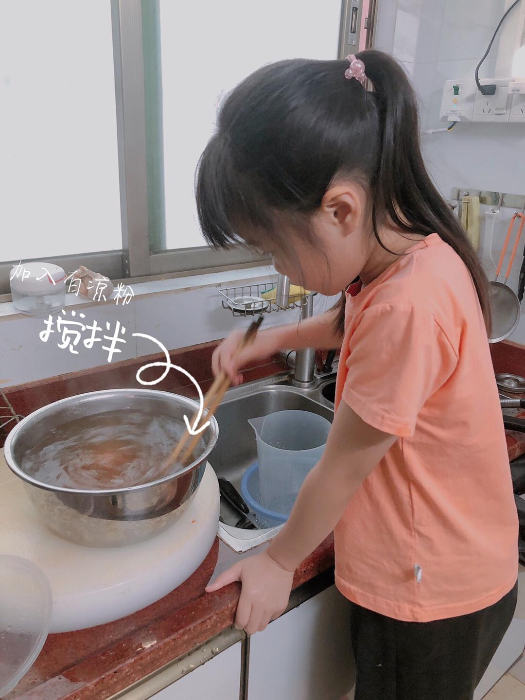 这里是2000ml的水,我用了2包100克的白凉粉,趁着热的时候倒进去搅拌均匀,一定要搅拌均匀,要不然就会结块,口感不好。
