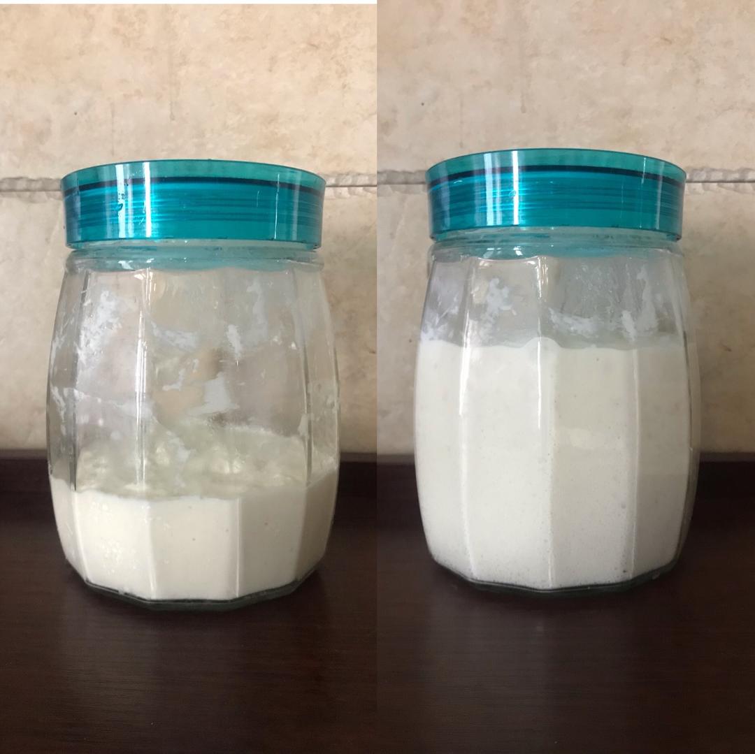 过滤出酸奶酵母原汁,加入等量高筋面粉,搅拌均匀。 第一次发酵到2-3倍大,可以看到很多小气孔 (28C 4小时左右)