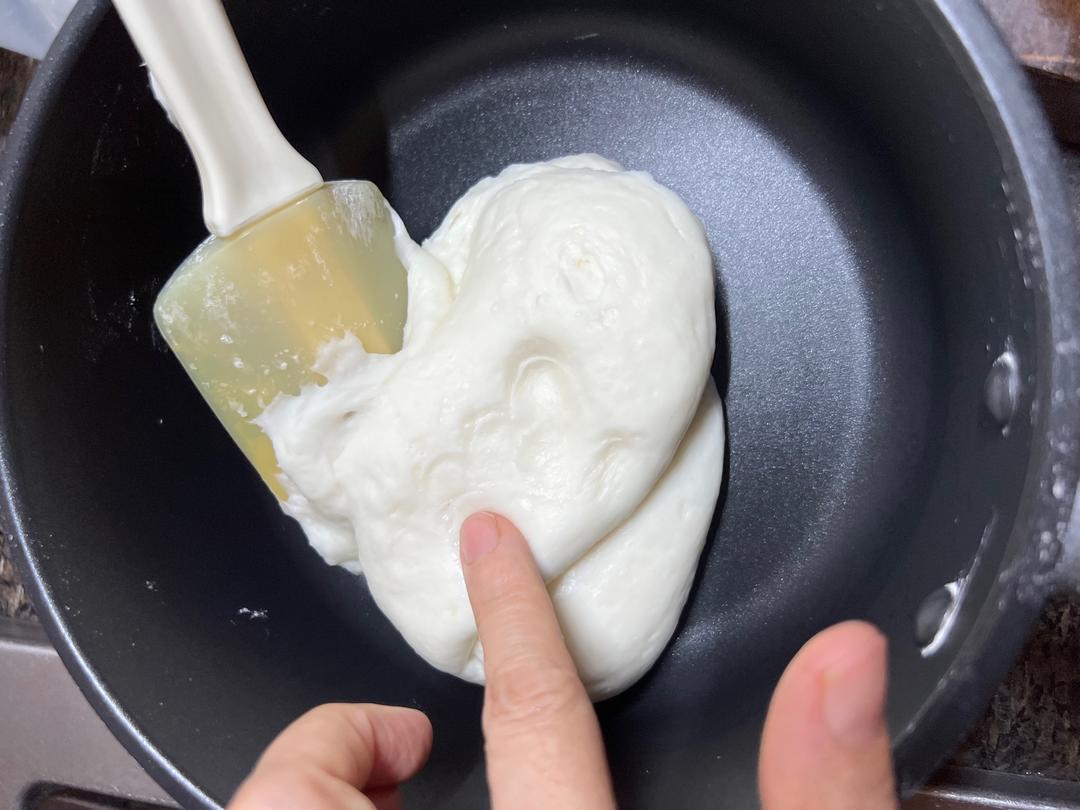 1.准备小奶煲 2.高筋面粉过筛 3.把高筋面粉,糖,盐,玉米油,牛奶放到奶煲里