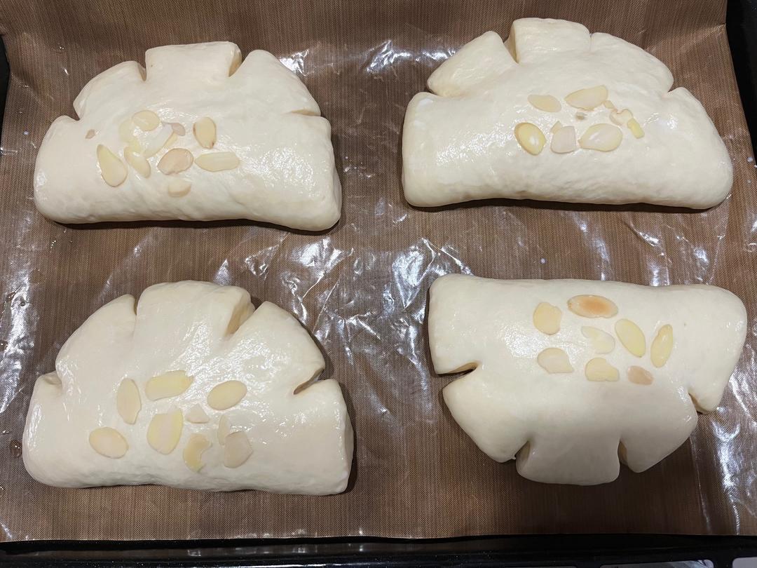 发酵完成后刷上牛奶或者蛋液,放上杏仁片 发酵温度时间参考:33C 30-40分钟