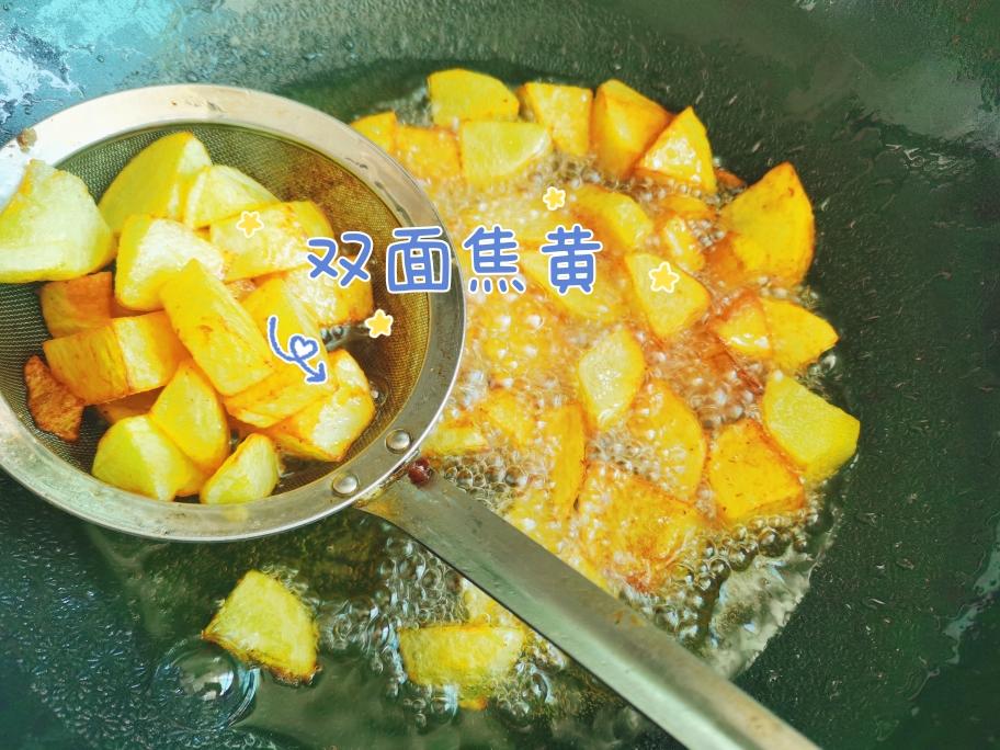 鸡肉都炸好后,就可以放土豆块下去炸了,炸至两面金黄。