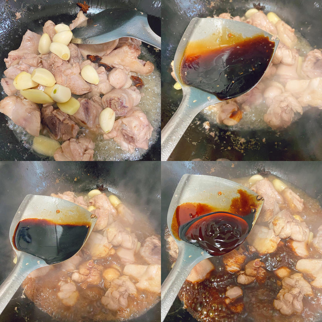 加入姜蒜八角,翻炒片刻 接着在调味:加两勺生抽,一勺老抽、一勺蚝油