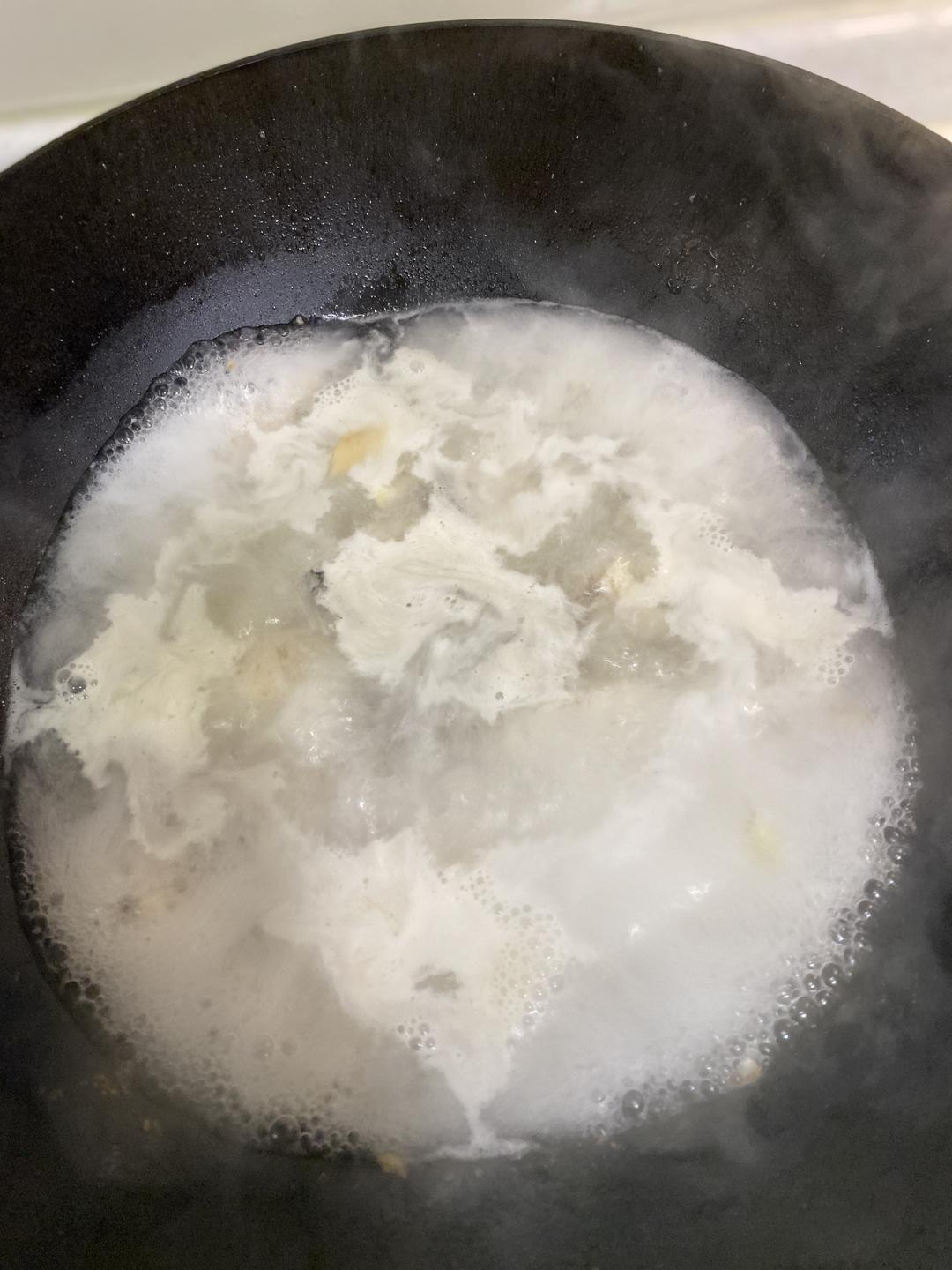 另外拿个锅子烧热放油,把鱼骨下锅煸炒一下,然后倒入适量开水开大火猛煮。