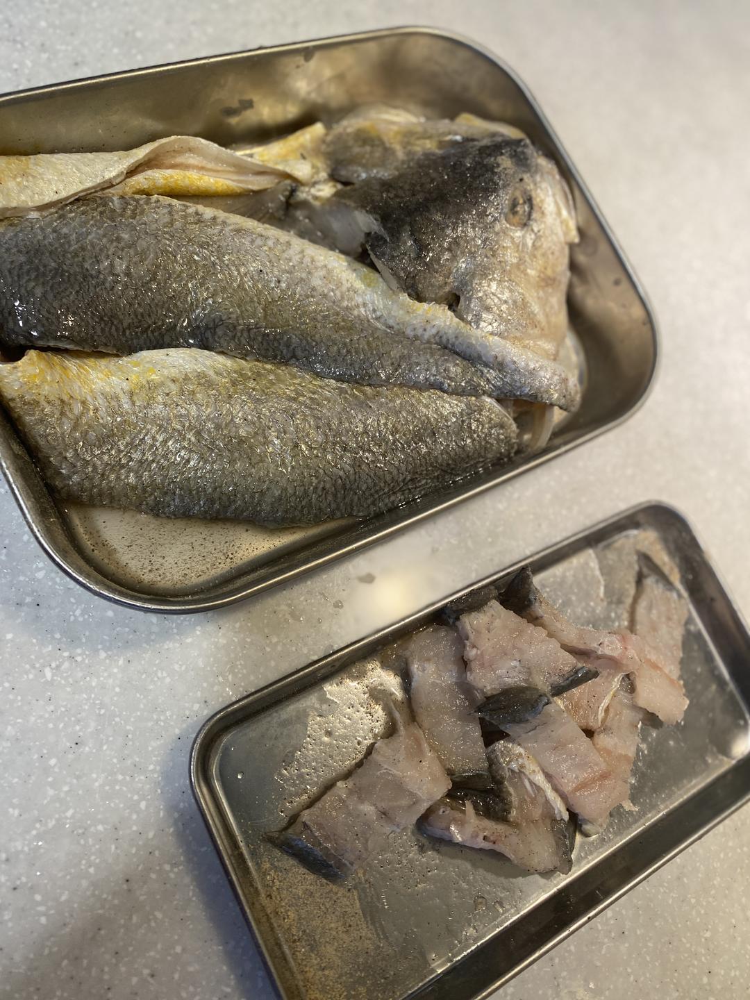黄鱼先清洗干净,这种都是去鳞去好内脏的,方便我这样的懒人。要把肚子里和头部的黑膜去干净,这样能减少腥味。有的说黄鱼的头皮那里特别腥,要去除一下。洗干净以后把鱼水分擦干,鱼头切掉,然后贴着鱼骨把两边的鱼肉片下来。
