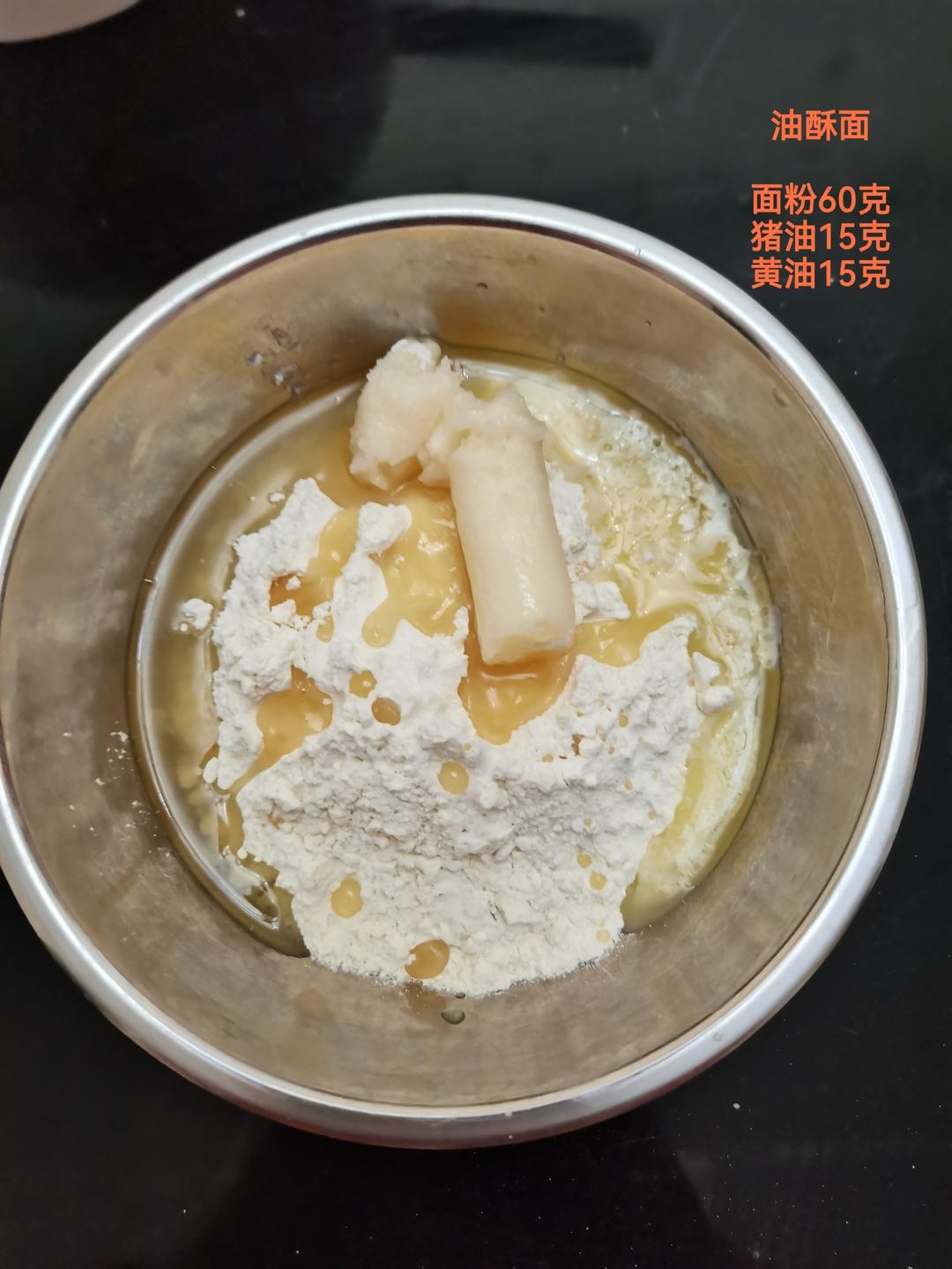 油酥面: 面粉60克。猪油15克。黄油15克