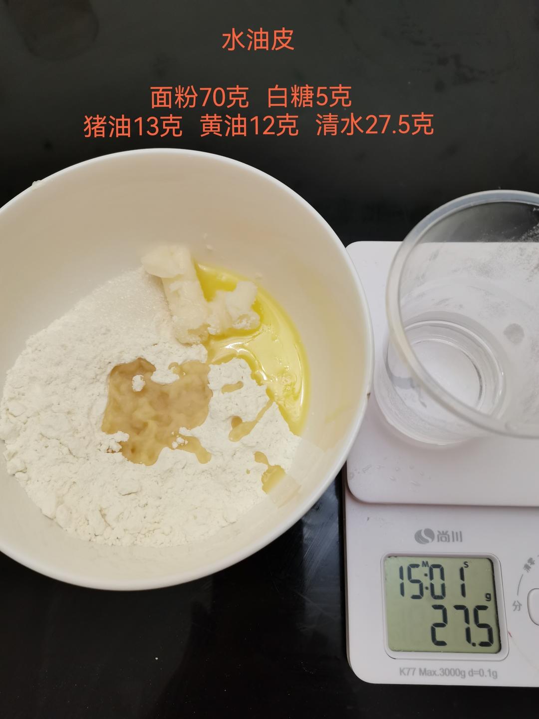 水油皮: 面粉70克。白糖5克。猪油13克。黄油12克。清水27.5克