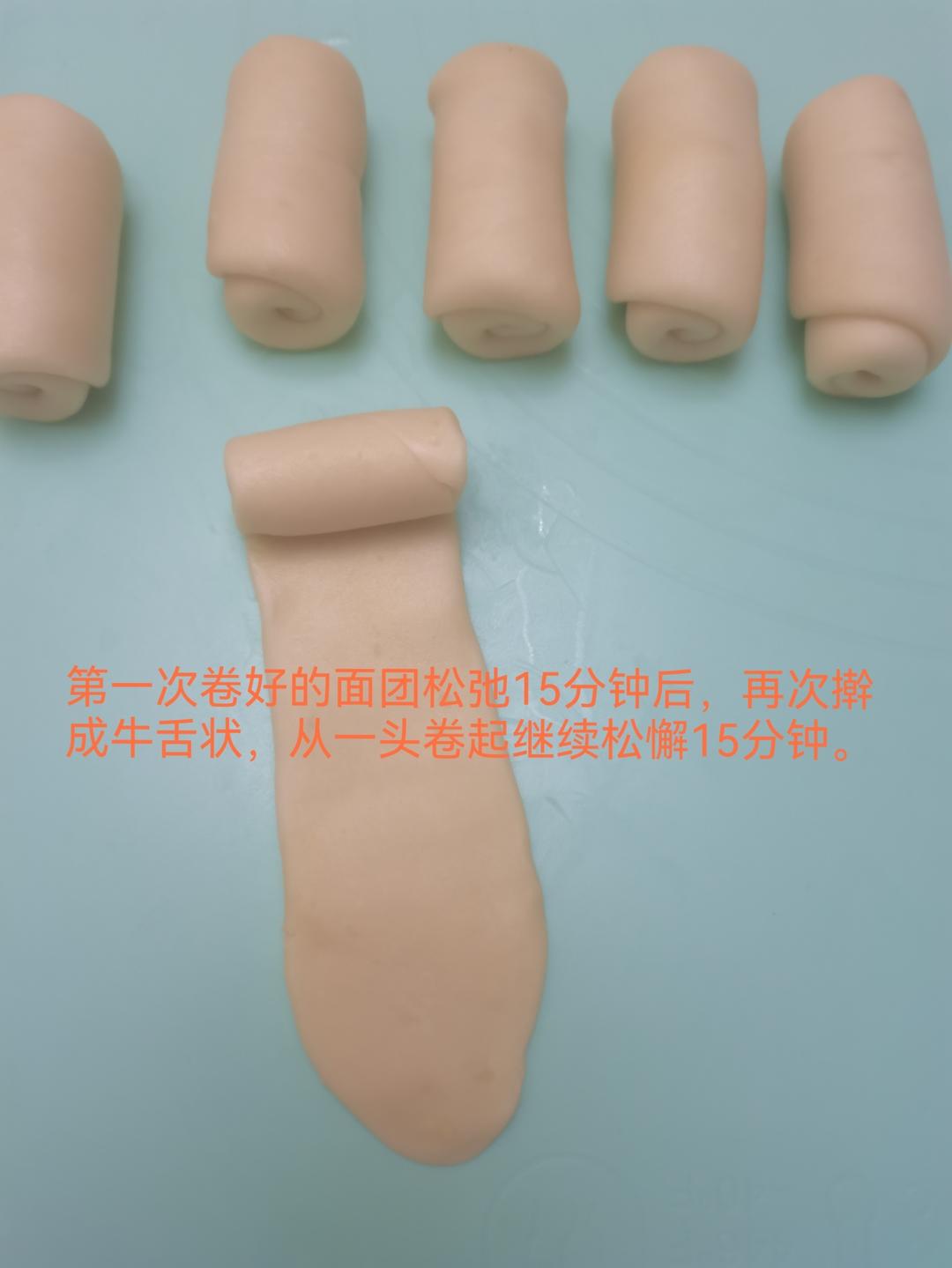 松弛好的面坯再次擀成牛舌状,从一头卷起,松驰15分钟。