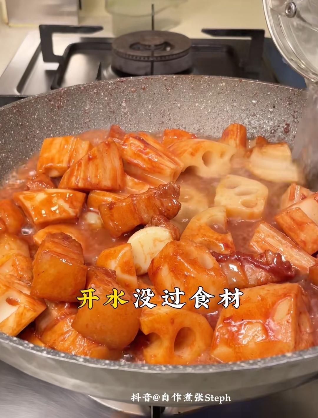 然后放莲藕翻炒均匀!放开水,没过食材!小小火45分钟! 试味的时候可以稍稍加点糖! 半勺花生酱!可不放 勾芡收汁!