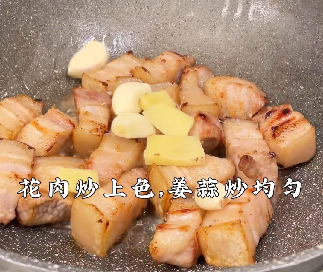 五花肉上锅炒,放姜蒜翻炒均匀,然后放料酒,