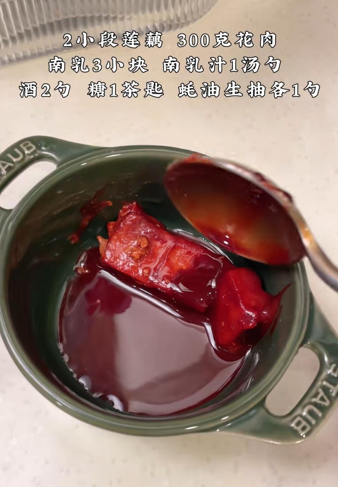 酱汁 2小段莲藕,300克五花肉的料汁 南乳3块,南乳汁1汤勺,酒2勺,糖1茶勺,耗油生抽各一勺!