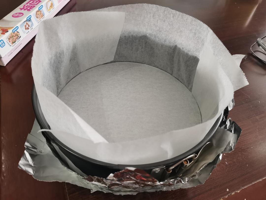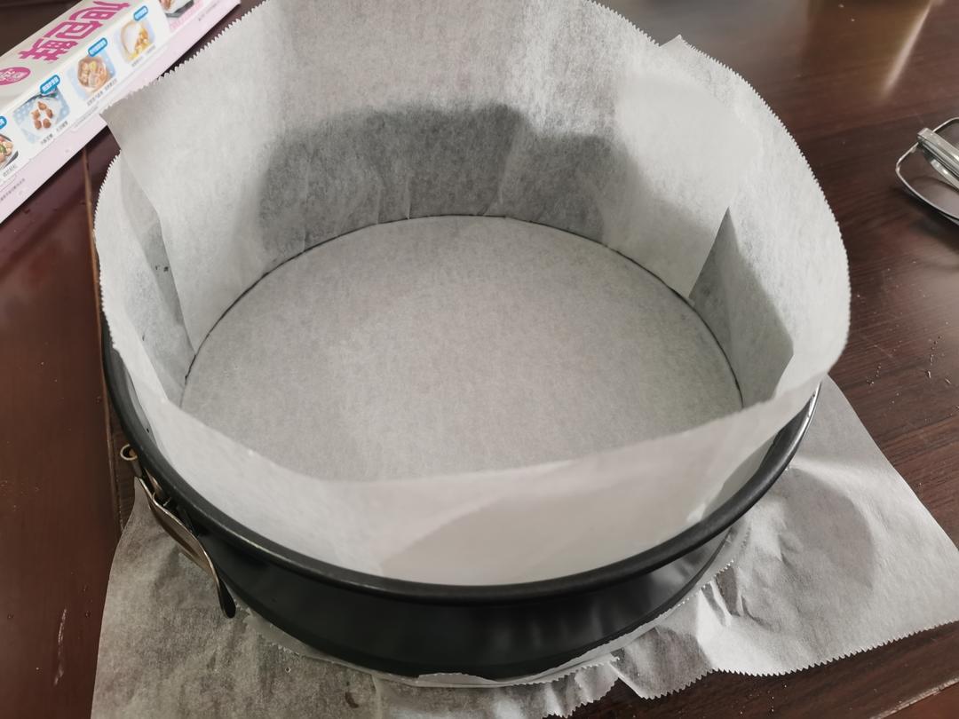 先来准备模具,家里没买方盘,最大的就是这个八寸的了,先用烘焙纸包一下